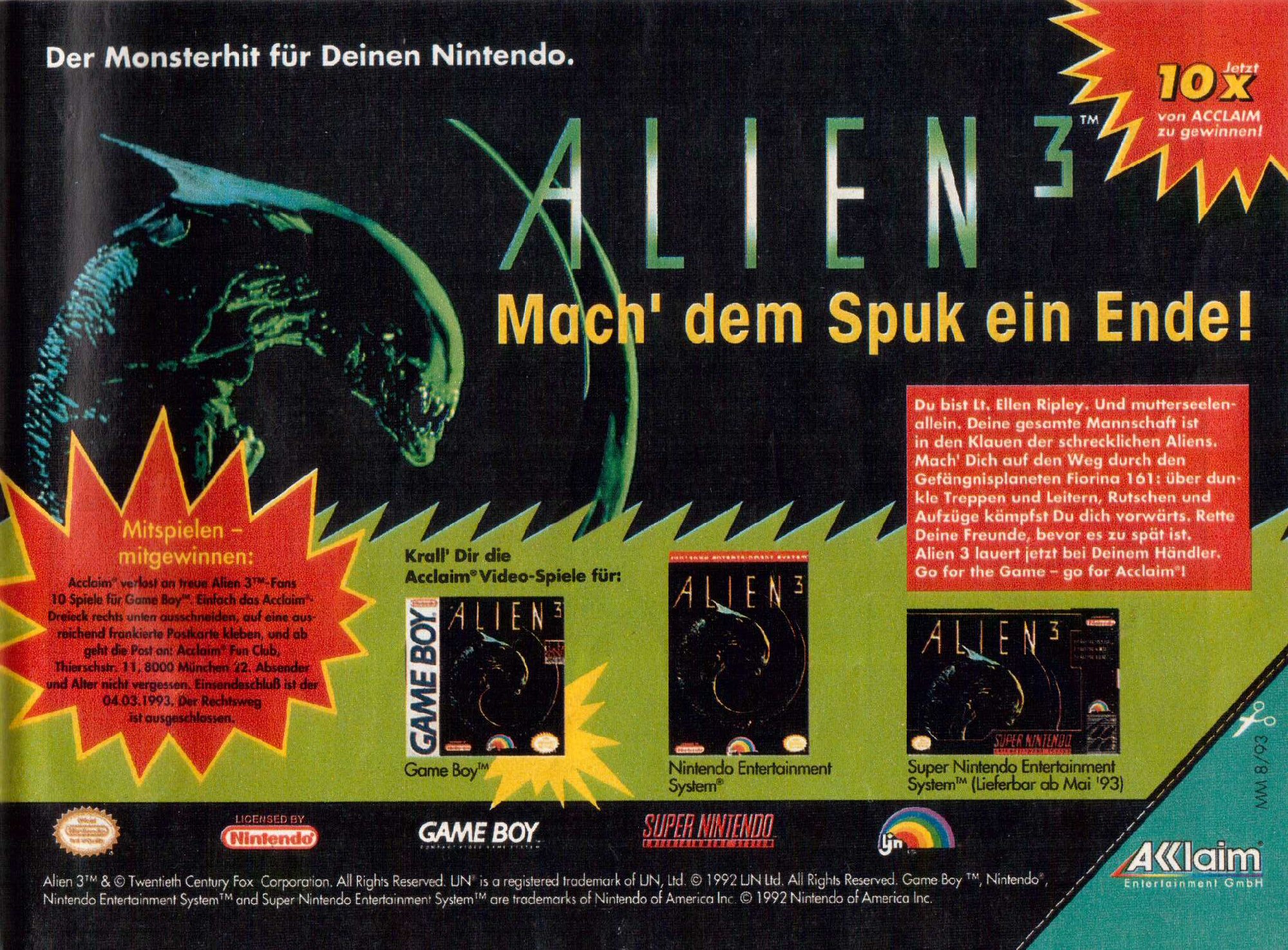 (pwc) „Der Monsterhit für Deinen Nintendo“ – was immer das auch bedeuten mag. Trefflich streiten lässt sich bestimmt auch in der Frage, ob dieser Monsterhit tatsächlich auch ein Hit ist. Ich denke, das wird wohl jeder für sich selbst entscheiden müssen. Festzustellen ist aber definitiv, dass sich Alien 3 auf dem Game Boy ganz anders präsentiert, als auf den übrigen zwei Nintendo-Konsolen. 1993 stand ich übrigens vor der Wahl mein Erspartes in Alien 3 oder Kirby’s Dream Land zu investieren. Am Ende wurde es Alien 3.