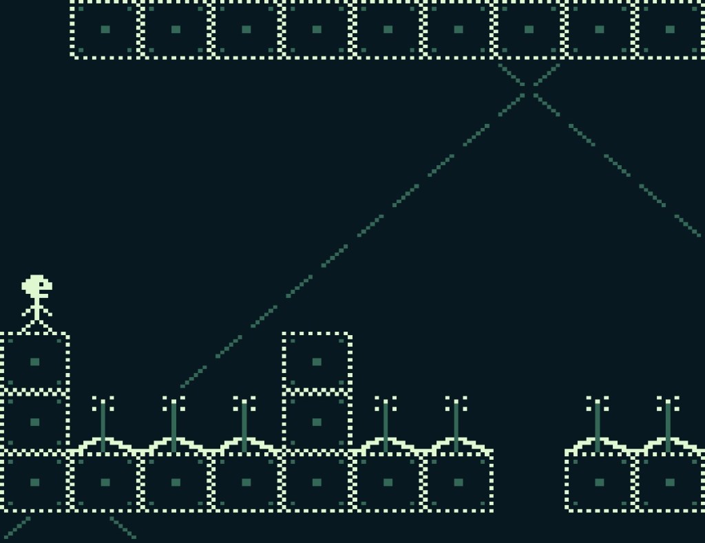 Ziel ist es, die Figur bis nach oben zum Bildschirm zu bewegen. Hierfür müsst ihr mehrere Spielabschnitte meistern, in denen eine Menge Gefahren lauern. Stacheln, bewegliche Hindernisse, bodenlose Abgründe – nur ein paar Beispiele, was euch erwartet.