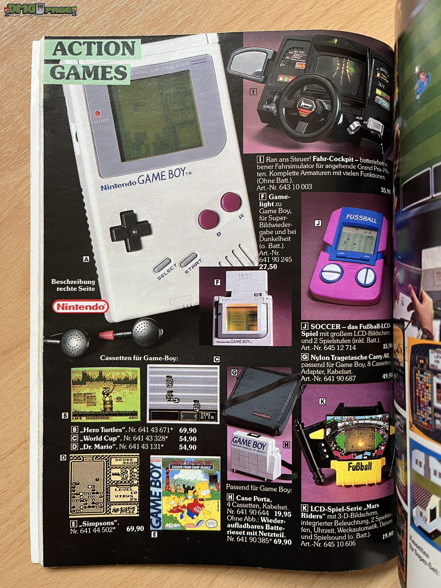 (pwc) Im vergangenen Monat stand das ►Buch der Wünsche aus dem Jahr 1994 im Vordergrund. Heute blicken wir zurück in das Jahr 1991. Einige Spiele und etwas Zubehör haben es in das Buch geschafft. Mit Teenage Mutant Hero Turtles – Fall of the Foot Clan (69,90 DM), Nintendo World Cup (54,90 DM) oder auch Bart Simpson’s Escape from Camp Deadly (69,90 DM) sind echte Klassiker vertreten. Auch das NUBY Game Light wird angeboten. Für 27,50 DM definitiv eine Überlegung wert. Neben Game Boy relevanten Seiten, wird auch das NES, Game Gear und Master System II beworben.