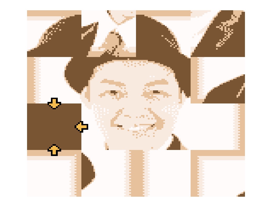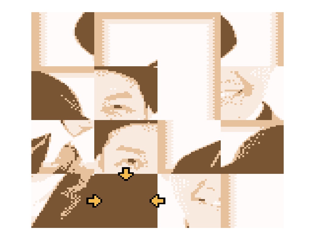 Konbu-chan Gaiden spielt man auf einem Raster von 4×4 Feldern. Dabei wurde eine besondere Eigenart umgesetzt: entgegen der mir bekannten Schiebepuzzles, bei denen mindestens ein Feld leerbleibt – man also immer mindestens zwei Steine verschieben kann, sind hier alle Felder belegt. Zu Spielbeginn wird das Motiv im Zufallsprinzip durchmischt. Im Anschluss wird ein Stein als Schiebestein bestimmt. Bewegt ihr diesen Stein, bewegt sich gezwungenermaßen immer auch ein anderer Stein mit. Der Schiebestein ist durch Pfeile gekennzeichnet und die Bewegungsrichtung spiegelverkehrt. Drückt ihr das Steuerkreuz nach links, bewegt sich der Stein nach rechts.