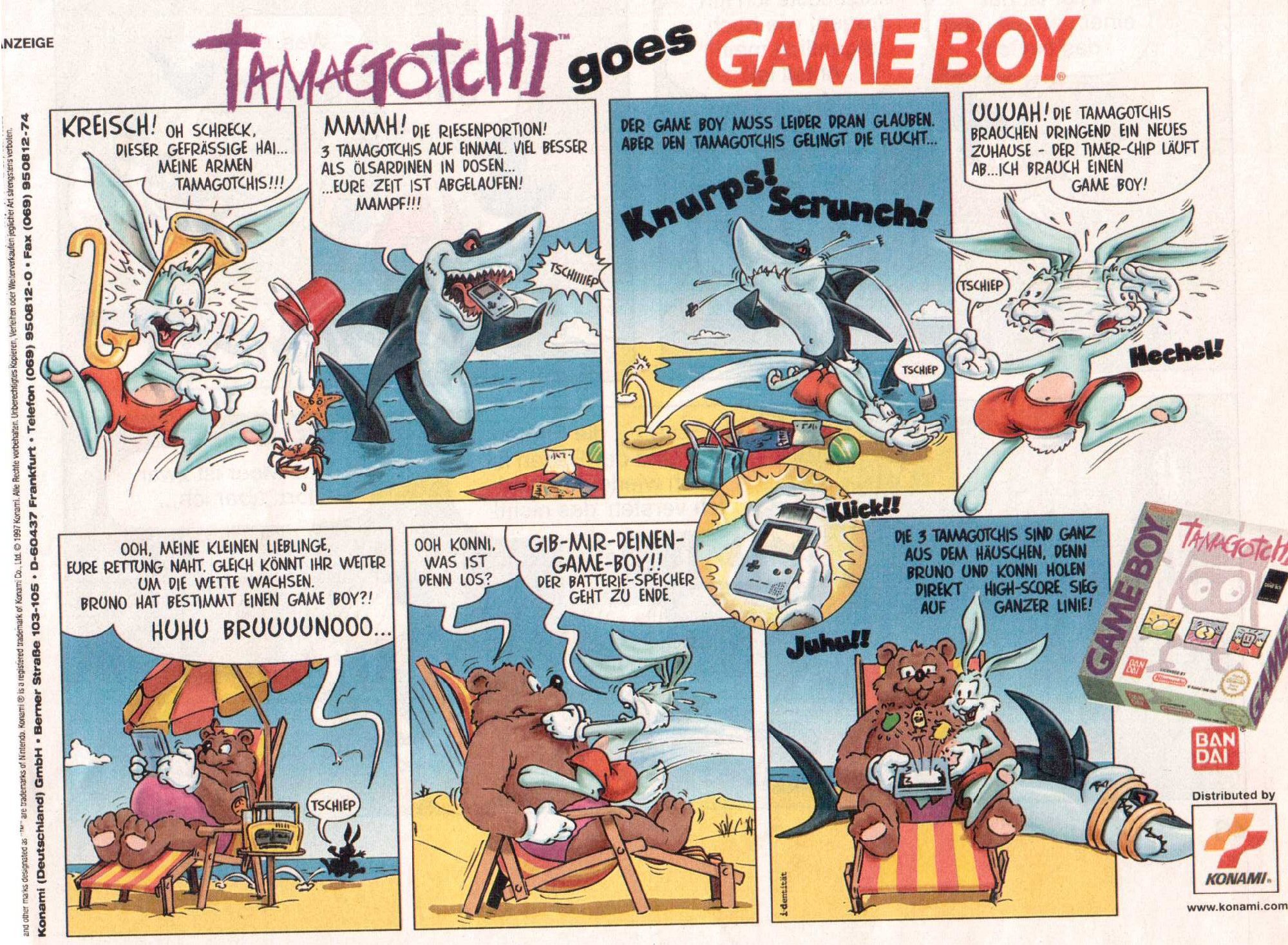 Auch auf dem klassischen Game Boy ist Tamagotchi noch erschienen. Die Werbeanzeige finde ich klasse, da sie das Spiel nicht plakativ sondern in Form einer Comic-Geschichte bewirbt. Wirklich sehr nett.