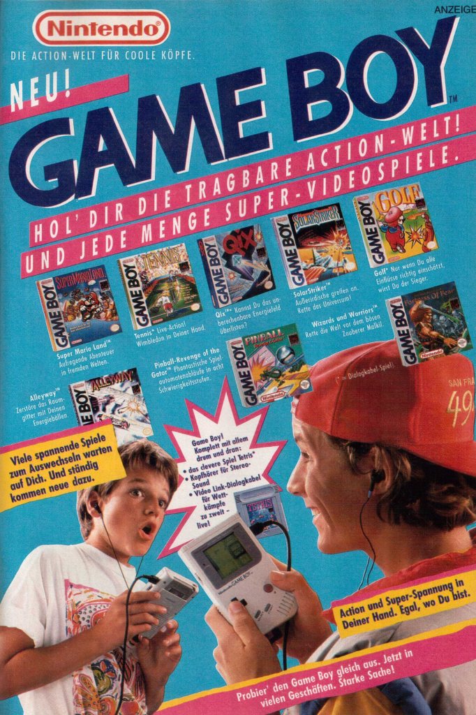 (pwc) Game Boy-Werbeanzeigen, die das Zwei- oder Mehrspieler-Vergnügen ansehnlich zur Schau stellen, finde ich persönlich richtig genial. Wenn man sieht wie viel Freude die beiden Jungs beim Zocken haben, würde man sich am liebsten selbst einen Kumpel schnappen und sofort mit Tetris, Tennis oder F-1 Race loslegen.