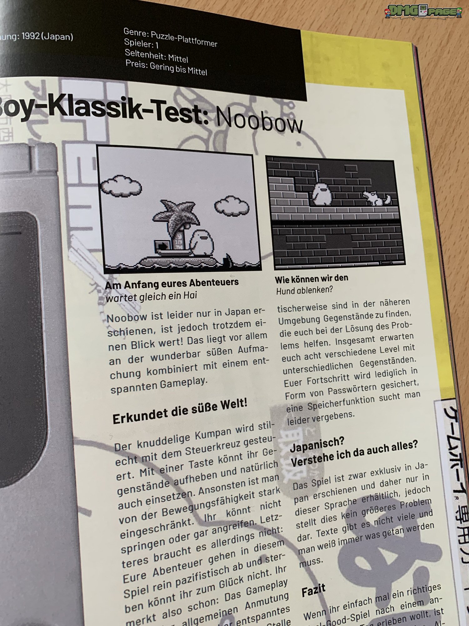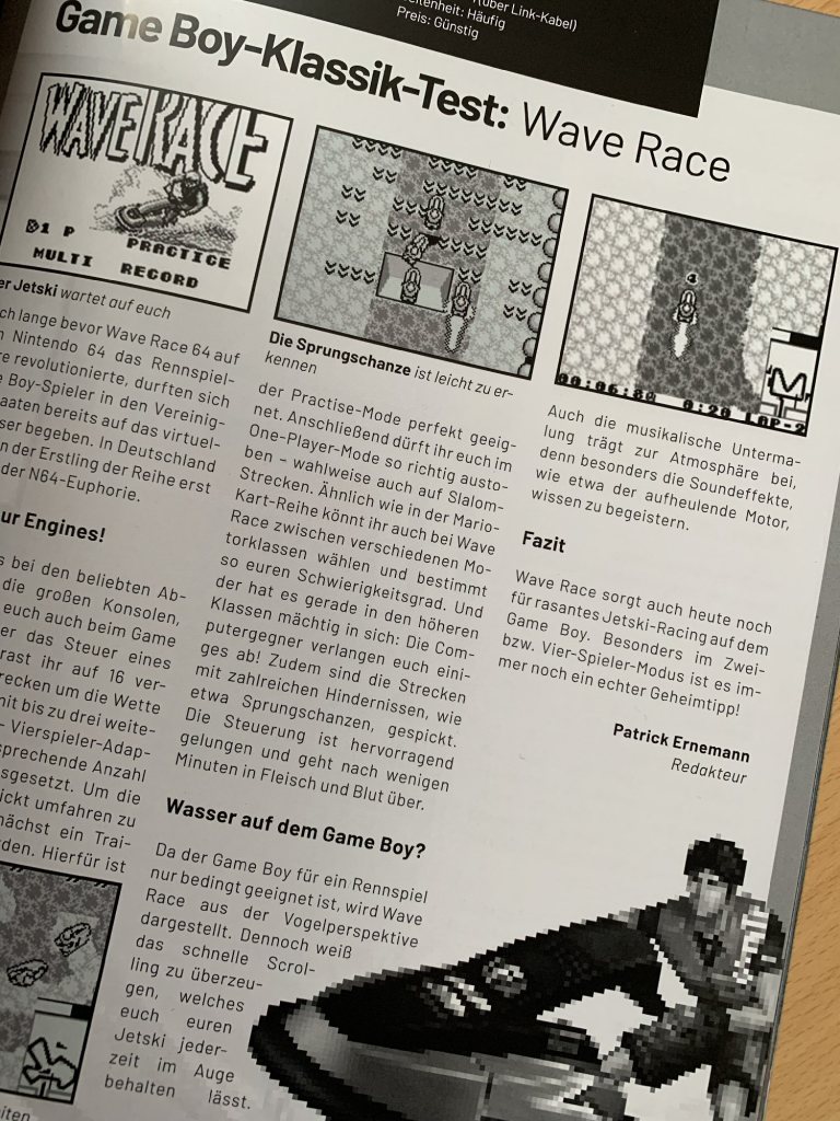Anders sieht es mit den zeitlich unkritischen Spielen aus. Besonders hat es mir der Retro-Testbereich angetan und speziell natürlich die Beschäftigung mit dem Game Boy. Auf jeweils einer Doppelseite werden zwei Spiele vorgestellt. Bisher waren dies Tetris & Mega Man Dr. Wily’s Rache, Super Mario Land & Wave Race sowie Pokémon Rote und Blaue Edition & Noobow. Bei Noobow handelt es sich um einen Gastbeitrag von Henning alias Retro Gaming Panda.