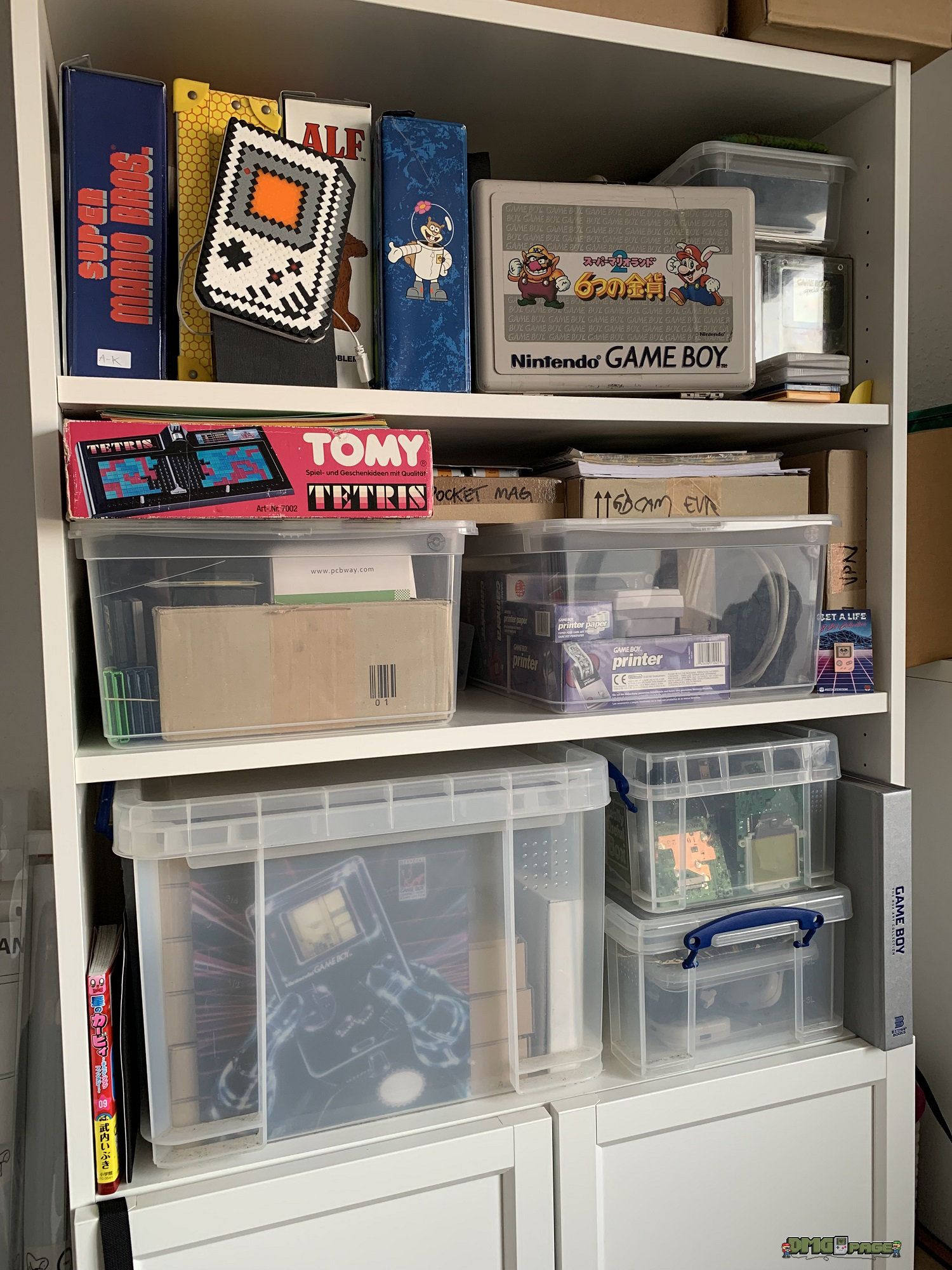 Nach der obligatorischen Führung durch die Gemächer, bin ich auf ganz wundervolle Dinge gestoßen: ein Game Boy 3D-Wackelbild, der lustige Animal Crossing Aufsteller, unzählige lose Module und Hardware ganz säuberlich in Kisten verpackt und alphabetisch geordnet. Was direkt auffällt und mich an meine eigene Kindheit erinnert: die klassischen MC-Sammelkoffer. Super Mario Bros., Biene Maja, ALF und Spongebob. Ich hatte seinerzeit einen Masters of the Universe Koffer.