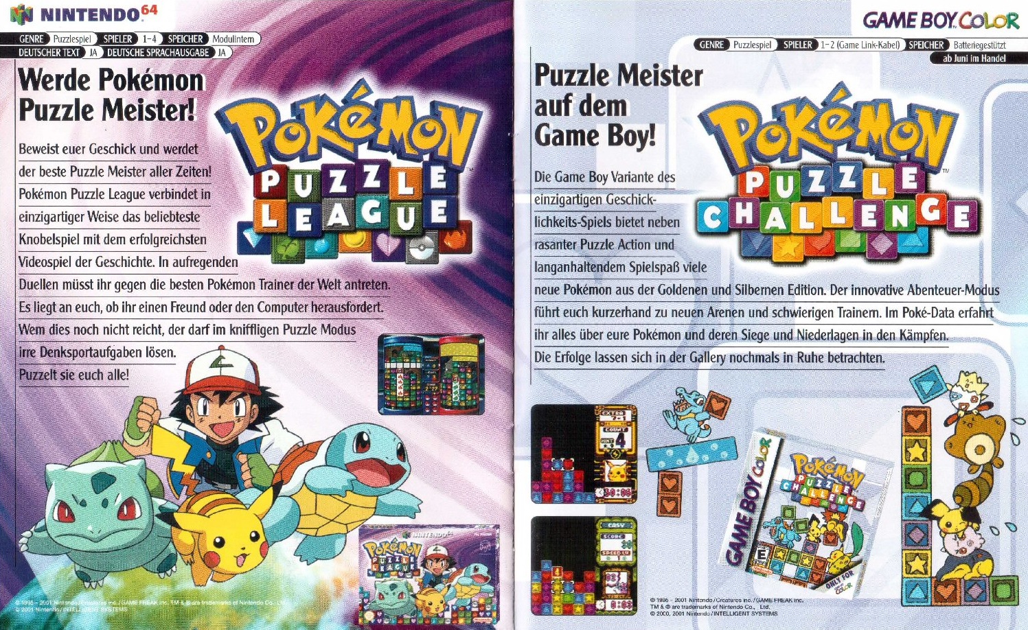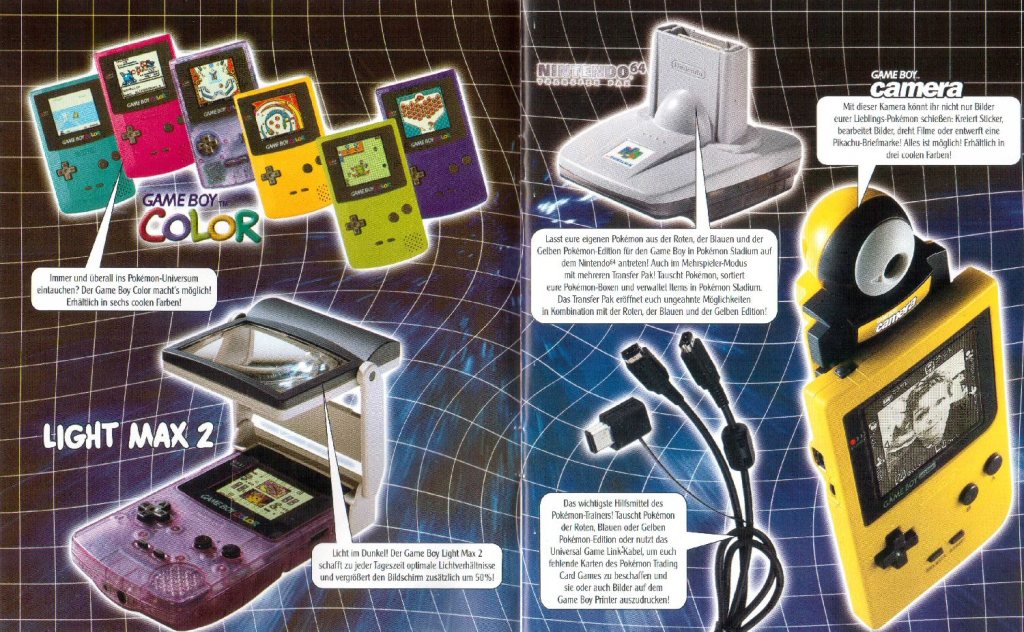 Pokémon rot, blau, gelb, der passende Spieleberater, die goldene und silberne Edition, das Trading Card Game, Pokémon Pinball, Stadium, Snap, Puzzle League und der Pikachu Color Schrittzähler – alle sind sie mit dabei und wollen in die Sammlung integriert werden. Sehr praktisch: auf der letzten Innenseite bietet euch die Broschüre eine Checkliste mit sämtlicher in Deutschland verfügbarer Pokémon Hard- und Software. Na dann – einfach ankreuzen und als Geburtstags- oder Weihnachtswunschzettel den Eltern in die Hand drücken.