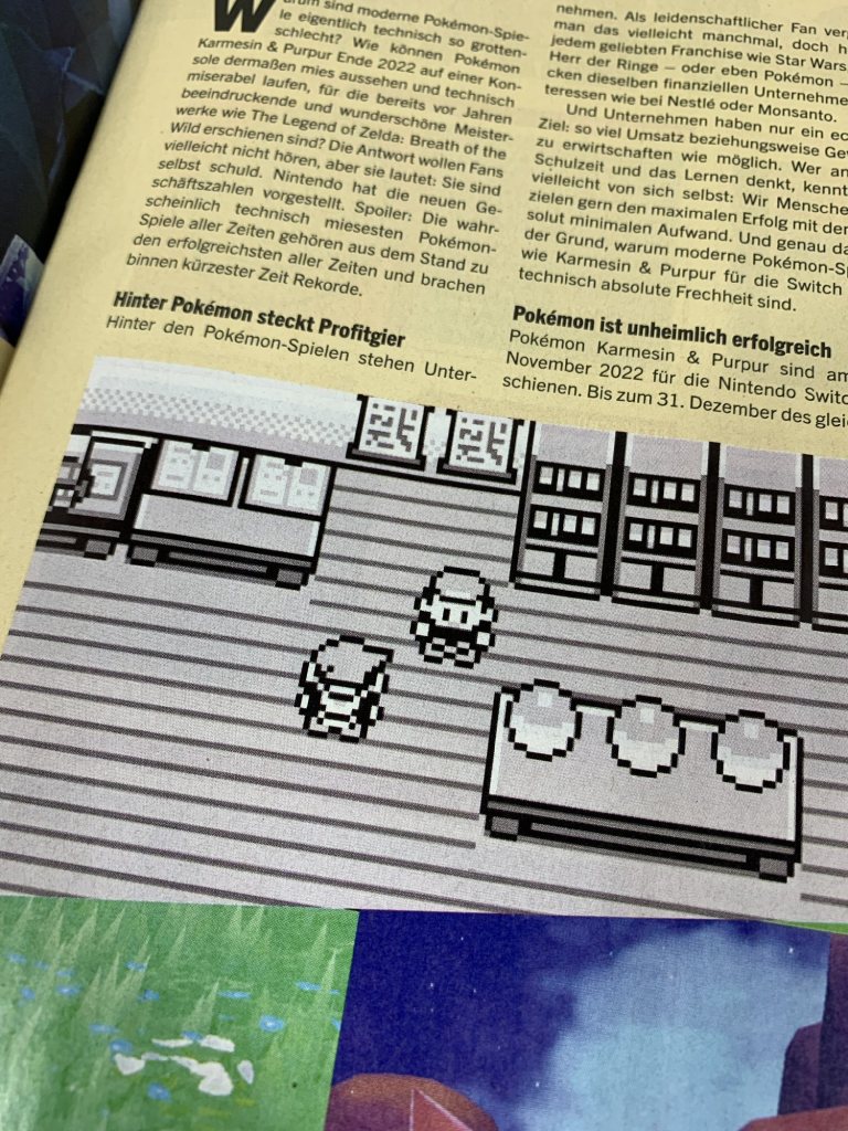 Kompromisslos ehrlich geht es in Johannes Gehlings Kolumne zu: „Wir sind selbst Schuld, dass Pokémon-Spiele so mies sind …“. Und ja, Pokémon Karmesin und Purpur sind technisch betrachtet eine Frechheit – aber die Käuferinnen und Käufer scheint das offensichtlich nicht arg zu stören – so konnten von beiden Titeln in Windeseile Rekordverkäufe verbucht werden. Wie schön, dass sich in den Bericht dann auch wenigstens ein Screenshot aus der guten alten Pokémon-Zeit eingeschlichen hat.