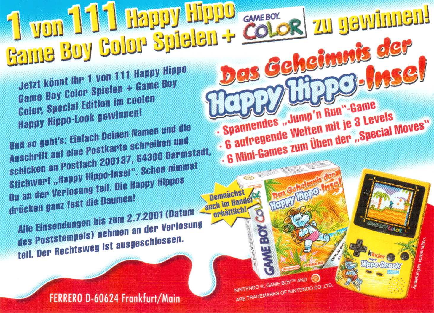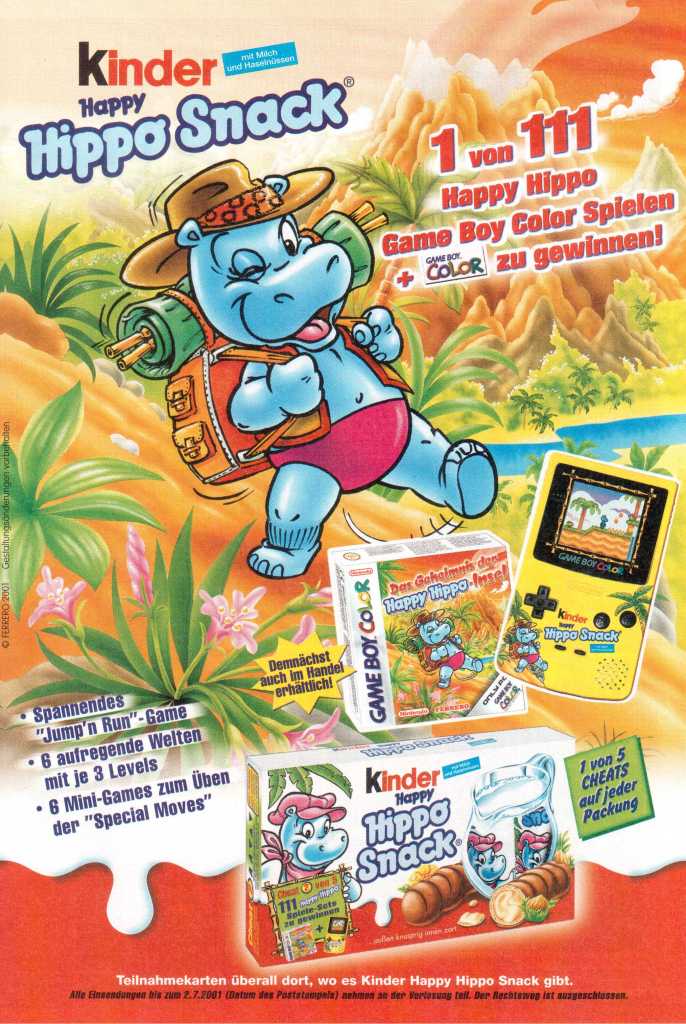 (pwc) Könnt ihr euch an die kinder Happy Hippo Snacks erinnern? Die gibt es auch heute noch – allerdings unter den Produktbezeichnungen Happy Hippo Kakao und Happy Hippo Haselnuss. Im Jahr 2001 startete Ferrero ein tolles Gewinnspiel, bei dem man mindestens 111 mal das Game Boy Color Spiel Das Geheimnis der Happy Hippo-Insel und 111 mal einen speziell gestalteten Game Boy Color gewinnen konnte. Der Einsendeschluss endete mit Ablauf des 02.07.2001.