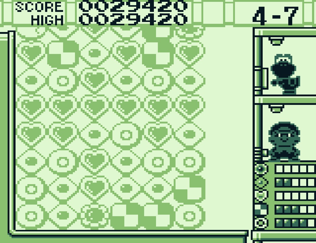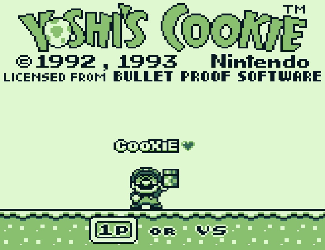 Yoshi’s Cookie für den Game Boy darf natürlich auch nicht fehlen! In 10 Runden mit je 10 Backstufen ist das Ziel, die zufällig zusammengestellten Kekse auf dem Bildschirm zu eliminieren. Jede Runde beginnt bereits mit einer bestimmten Anzahl vorgegebener Kekse, die im Laufe des Spiels durch zusätzliche vertikale oder horizontale Keksreihen ergänzt werden.