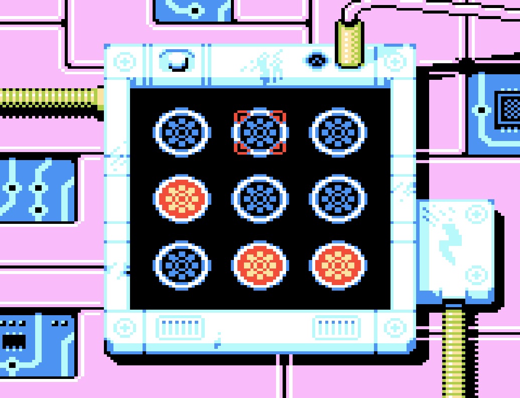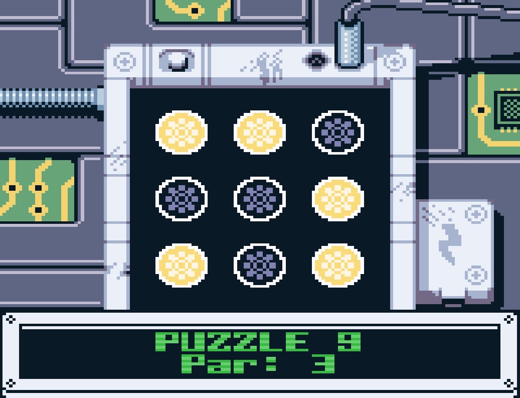 Beispiel: im letzten möglichen Zug, der praktisch das Rätsel lösen könnte, müsst ihr eine Situation schaffen, in der nur noch drei Lampen im rechten Winkel einer Ecke leuchten. Klickt dann auf das Feld, das sich in der Ecke befindet, um das Level zu beenden. Gelingt euch diese Feldformation nicht, braucht ihr erst gar nicht mehr weiterspielen sofern ihr am Freischalten mindestens der Intellivision-Palette interessiert seid.