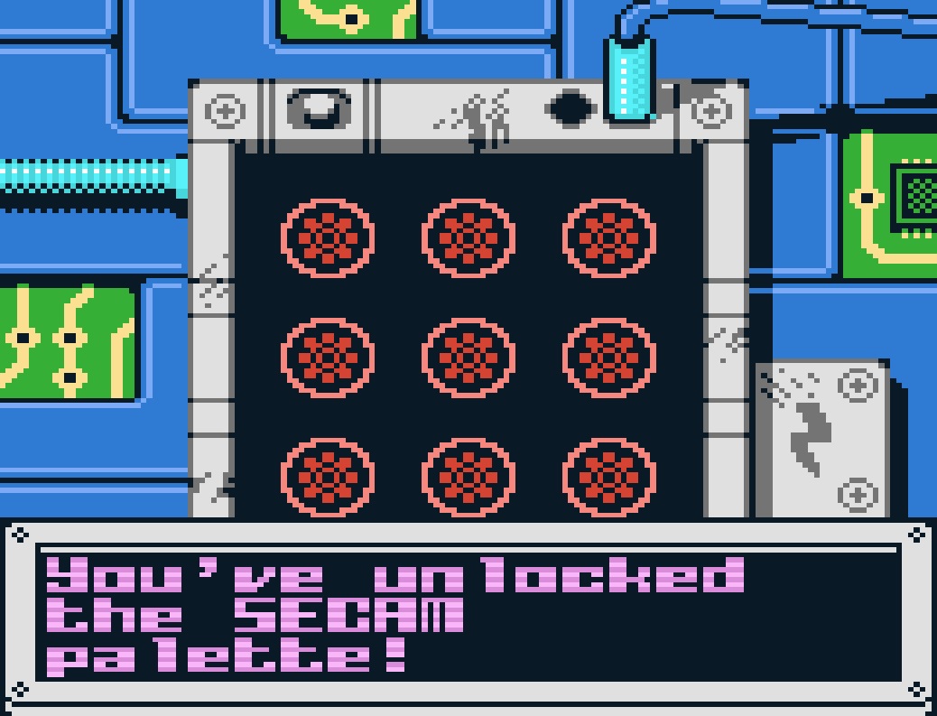 Aber: wenn du den Anspruch verfolgst, tatsächlich nicht mehr als die Minimalanzahl der Züge anzuwenden, wirst du mit freischaltbarem Content belohnt. Im Optionsmenü stehen diverse Paletten zur Verfügung, von denen dir bei Spielbeginn lediglich die Normale zur Verfügung steht. Löst du die ersten zehn Rätsel, wird die Magnavox-Palette freigeschaltet. Nach zwanzig gelösten Rätseln ist die Secam-Palette auswählbar. Dazwischen befindet sich aber auch die Intellivision-Palette. Hierfür musst du etwas mehr Zeit investieren und die ersten zehn Level energisch angehen: nur wenn du für jedes Level nicht mehr als die Minimalanzahl der Züge gebraucht hast, lässt sie sich freischalten.