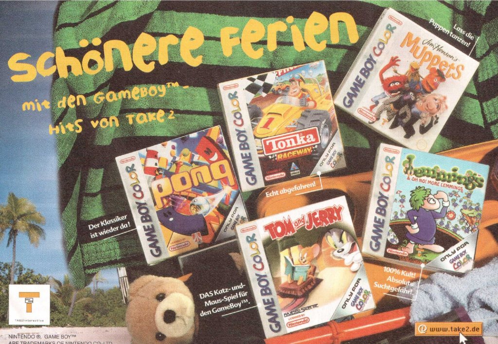 (pwc) Ja das ist doch mal eine Ansage. Die Ferien sind schön – aber viel schöner sind sie mit Game Boy Color Spielen von Take 2. Lasst uns mal genauer hingucken: Muppets, Lemmings & Oh No! More Lemmings oder auch Tom and Jerry sind mit dabei. Damit lässt sich schon etwas anfangen. Als Totalausfall würde ich nur Pong bezeichnen. Diese Version ist wirklich grausam.