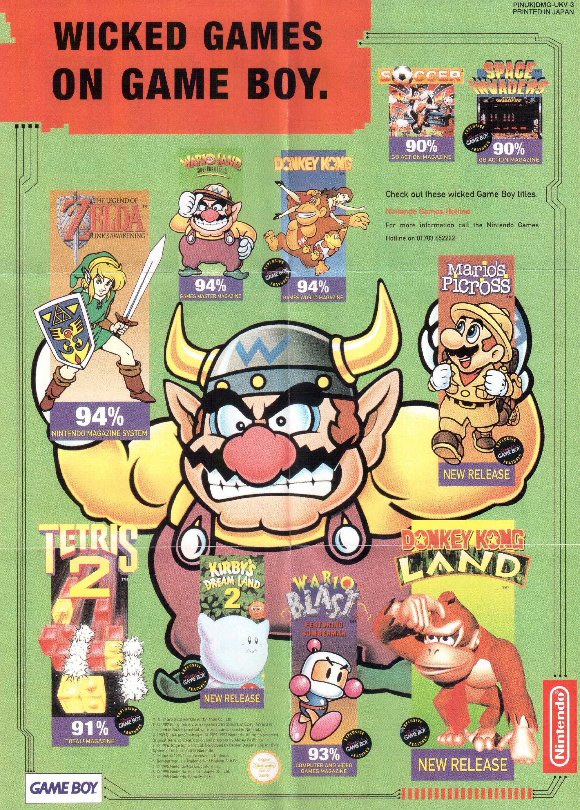 (pwc) In diesem Flyer präsentiert euch ein muskelbepackter Wario Game Boy Spiele, die ausnahmslos Wertungen über 90 % vorweisen oder so neu auf dem Markt sind, dass eine Wertung noch aussteht. Kurios: einigen Spieletiteln wurden Grafiken zugewiesen, die später beim Design der Packung unberücksichtigt blieben. Ganz deutlich ein Platzhalter ist die Grafik zu Kirby’s Dream Land 2, welche aus dem ersten Dream Land Spiel stammt.