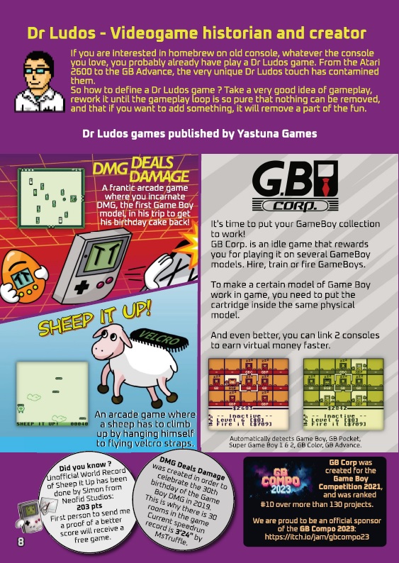 Die Game Boy-Fraktion wird von Spielen wie Asteroids Chasers, DMG Deals Damage, Sheep it up! oder auch GB Corp. vertreten. Besonders nett finde ich die kleinen Schnipsel an Hintergrundinformationen, die sich schön unauffällig in die Seiten integrieren. So erfahrt ihr, dass der derzeitige Rekord bei Sheep it up! von Simon/Neofid Studios mit 203 Punkten gehalten wird. Du kannst die Punktzahl überbieten? Dann direkt ein Foto an Frédéric senden und du erhältst ein Gratisspiel.