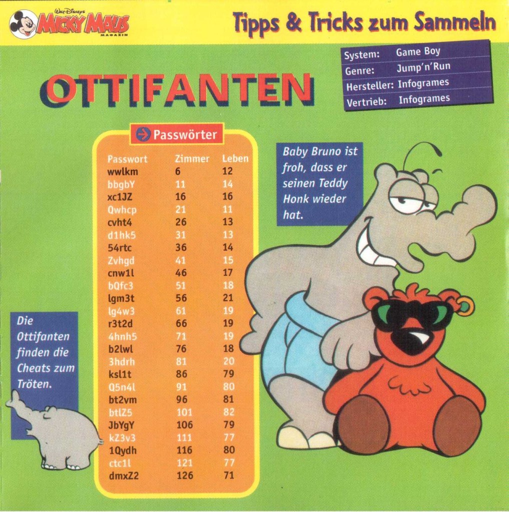 (pwc) Dem Micky Maus-Heft vom 22.07.1999 liegen vier coole Tipps & Tricks Sammelkarten bei. Vertreten sind diesmal Final Fantasy VII (PSX), South Park (N64), R-Type Delta (PSX) und Ottos Ottifanten – Baby Brunos Alptraum (Game Boy). Die Ottifanten-Sammelkarte gibt’s hier: