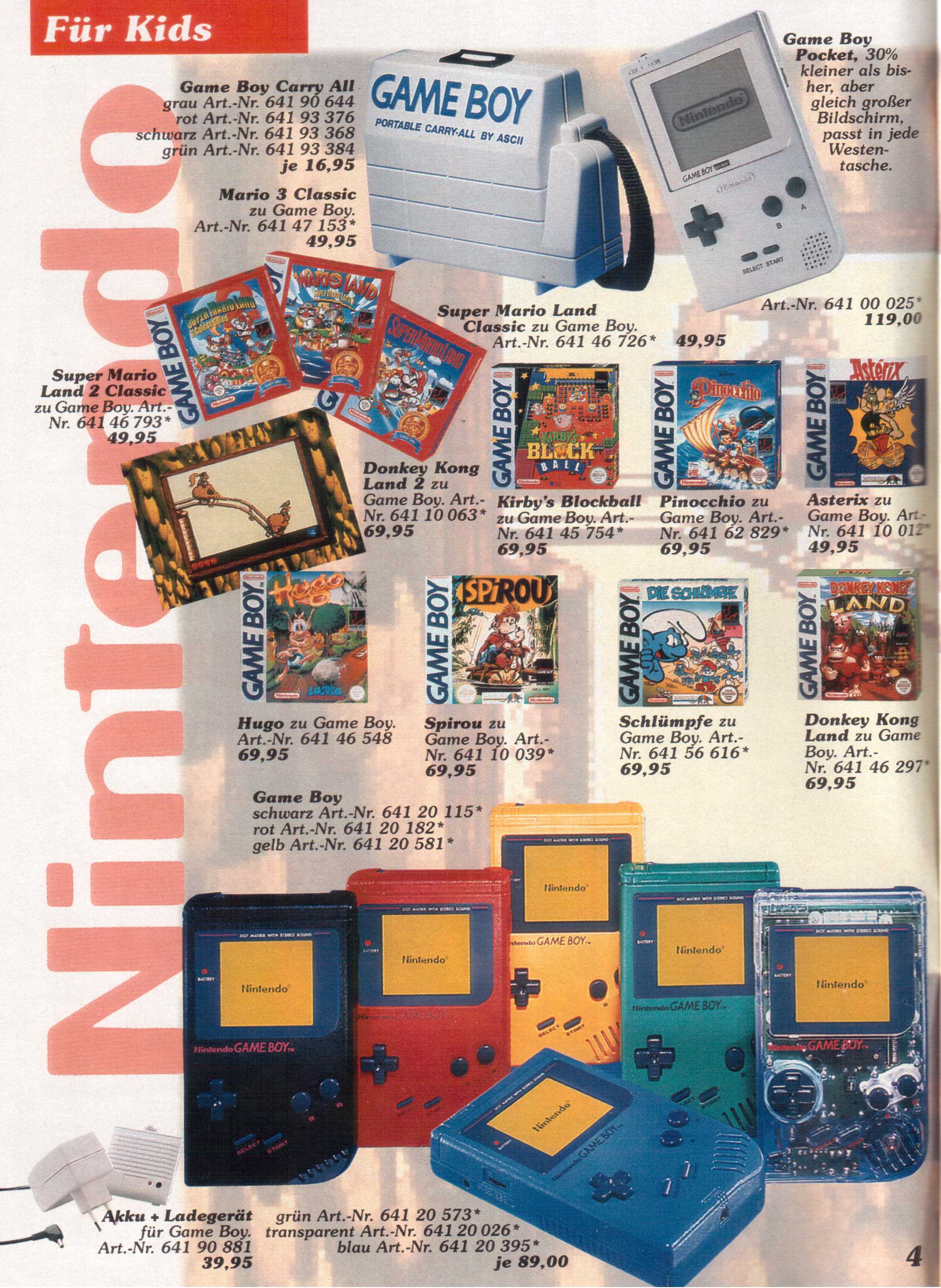Stichwort Mobilität: der Game Boy Pocket ist ebenfalls erhältlich – aber ganze 30 Mark teurer als eine der bunten Special-Editions. Den abgebildeten silberfarbenen Game Boy Pocket habe ich Anfang der 2010er Jahre auf einem kleinen Flohmarkt der hiesigen evangelischen Kirchengemeinde erworben – für 1 Euro. Angeblich sollte das Gerät defekt sein. Ich hatte keine Batterien einstecken, aber für den Preis habe ich direkt zugeschlagen. Zu Hause habe ich dann festgestellt, dass der Game Boy absolut einsatzbereit war.