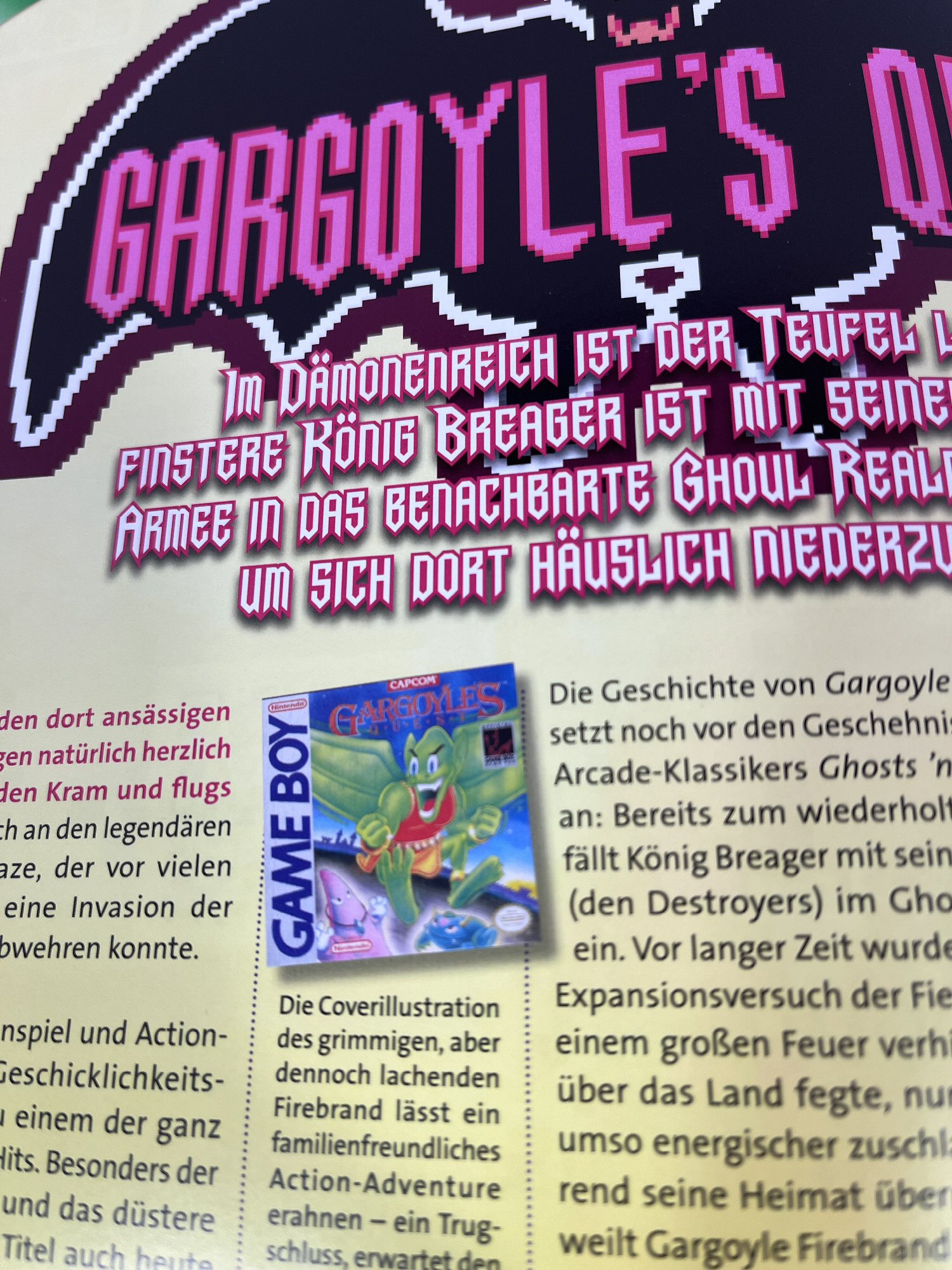 Kommen wir zum Highlight der aktuellen Ausgabe: dem Gargoyle’s Quest-Beitrag. Als eines der recht frühen Game Boy-Titel begeistert das Abenteuer um Firebrand mit grandioser Grafik, einer gruseligen Atmosphäre, einem durchdringenden Soundtrack und dem zur damaligen Zeit Capcom-typischen Schwierigkeitsgrad. Wie der Autor des Beitrags schon zu Beginn feststellt, steht die freundliche Coverillustration in keinem Verhältnis zum dargebotenen Spielinhalt. Wer eine passende Frustrationstoleranz und entsprechend Zeit mitbringt, sollte sich Gargoyle’s Quest definitiv einmal ansehen.