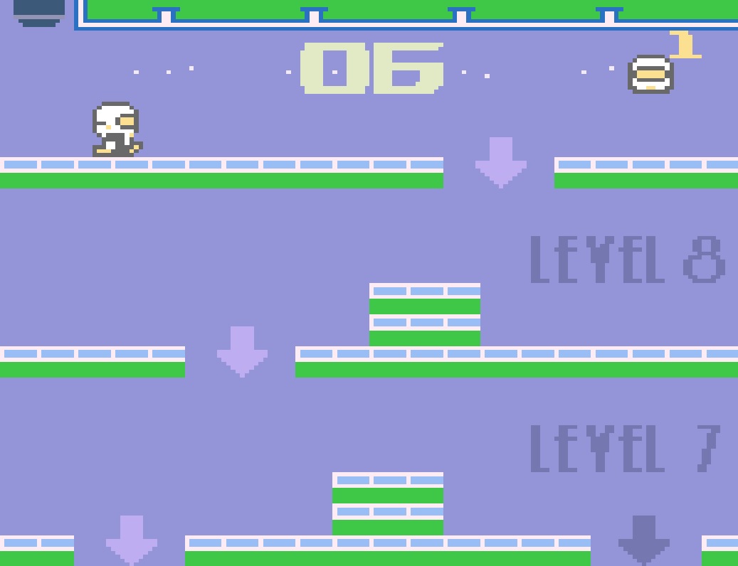 Insgesamt stehen dir praktisch unendlich viele Leben zur Verfügung. Das Spiel beginnt zwar mit genau vier Leben, doch sobald alle aufgebraucht sind, wirst du automatisch mit aufgefüllten Leben zurück in den ersten Stock versetzt. Problematisch ist eher die zeitliche Vorgabe von einer Minute – der Counter läuft nämlich gnadenlos ab. Ist die Zeit vorbei, gehst du Game Over.