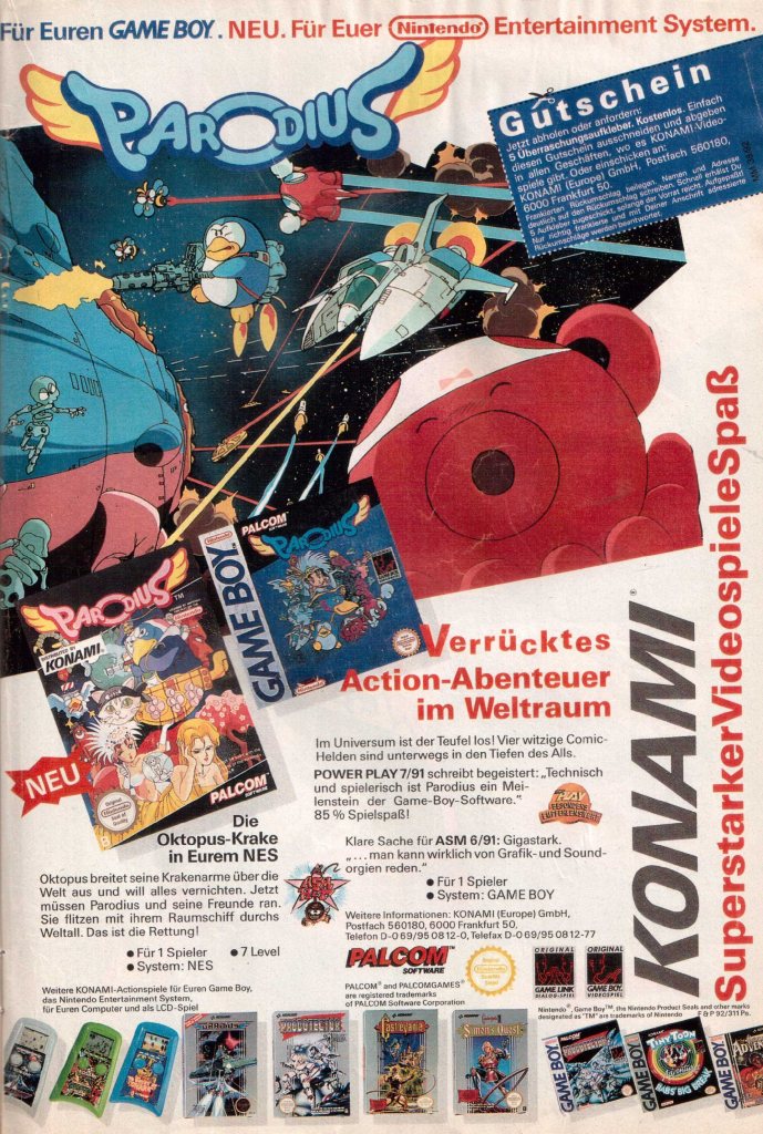 (pwc) „Im Universum ist der Teufel los! Vier witzige Comic-Helden sind unterwegs in den Tiefen des Alls.“ Die ASM 6/91 (Aktueller Software Markt) schreibt zu Parodius: „Gigastark. Man kann wirklich von Grafik- und Soundorgien reden“. Ziemlich starke Worte für ein Game Boy Classic Spiel. Aber Parodius ist schon ein sehr guter Shooter. Kein Wunder, kommt er doch aus dem Hause Konami.