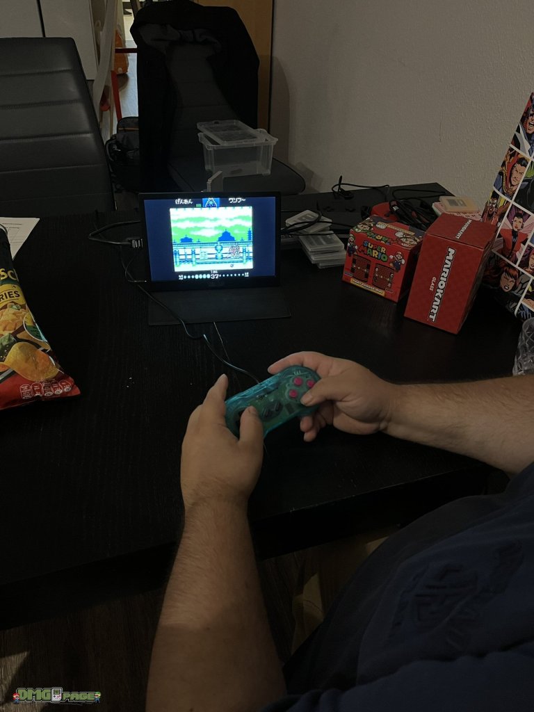 Fast Punktgenau nach Ende des Kreativteils, hat uns ein Unwetter von der Terrasse in die Wohnung vertrieben. Bei kuschelig warmer Temperatur ging es dann richtig los: die Konsolen/Handhelds und Spiele kamen auf den Tisch! Wieder mit am Start waren die absoluten Multiplayer-Klassiker Super R.C. Pro-Am, Qix, Yoshi’s Cookie, F-1 Race oder auch F-1 Hero GB ’92. Neben den bekannten 4-Spieler-Spielen, begeisterten auch diverse 2-Spieler-Spiele wie WWF Superstars, Balloon Kid, The King of Fighters ’95 oder Dr. Mario.