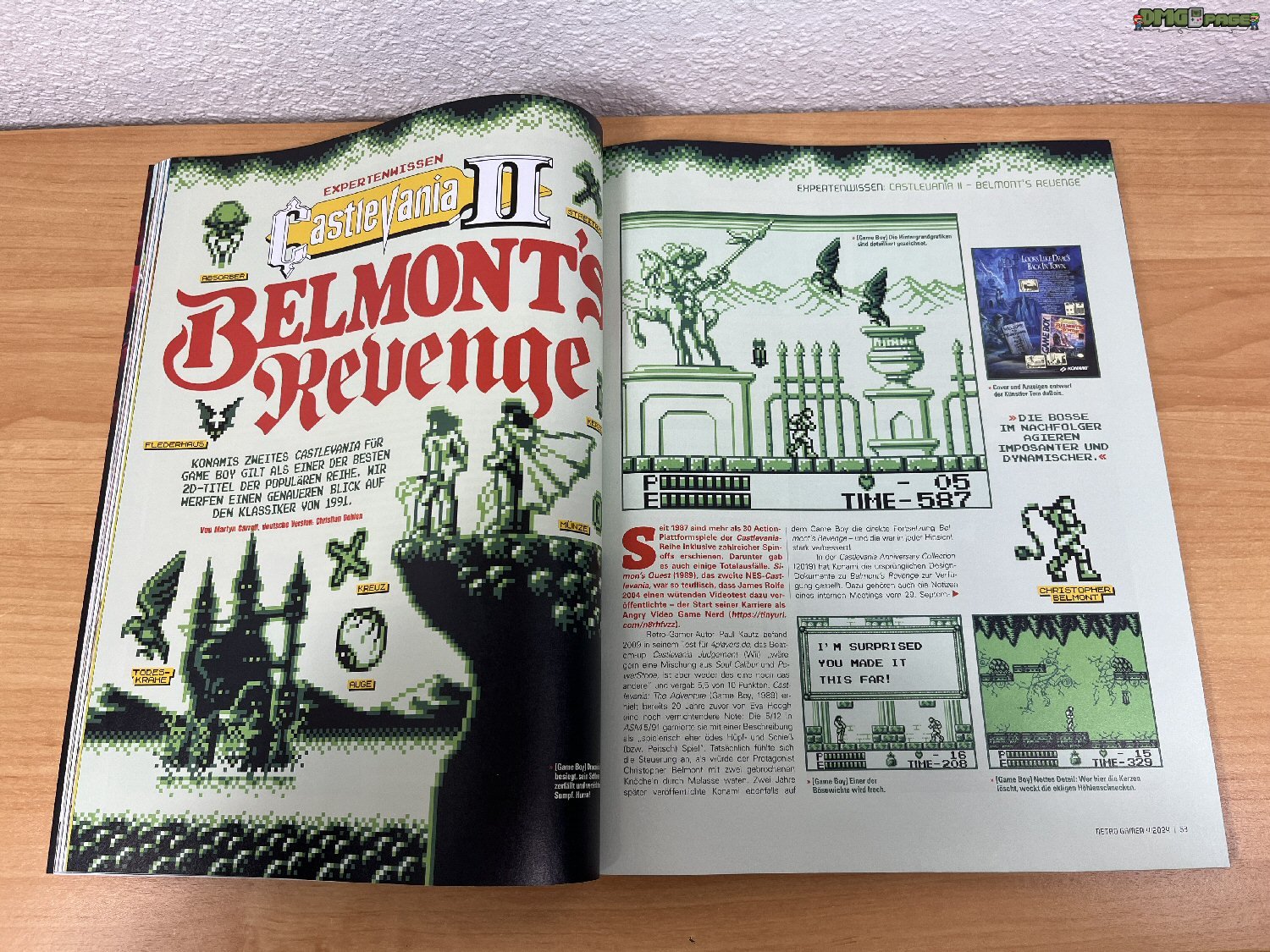 (pwc) In der aktuellen retro Gamer bekommt ihr einen unfassbar genialen Spieleklassiker präsentiert: Castlevania II Belmont’s Revenge. Der zweite von insgesamt drei Castlevania-Titeln für den klassischen Game Boy macht vieles richtig, an dem der erste Teil noch krankte und bietet etliche Neuerungen. So bewegt sich Christopher Belmont wesentlich schneller, am Seil hängend kann man seine Waffen einsetzen, neben der Peitsche stehen nun die Sekundärwaffen Axt (in der japanischen Version ein Kreuz) und Weihwasser zur Verfügung und auch die Rücksetzpunkte wurden fairer platziert. Der Beitrag beinhaltet auch ein kurzes Interview mit Tom Dubois, der das Titelbild der Papp-OVP gezeichnet hat. Interessant: Mindestens in die europäische und amerikanische Anleitung hat sich ein Fehler eingeschlichen. Christophers Sohn Soleil wird dort als Soleiyu bezeichnet.