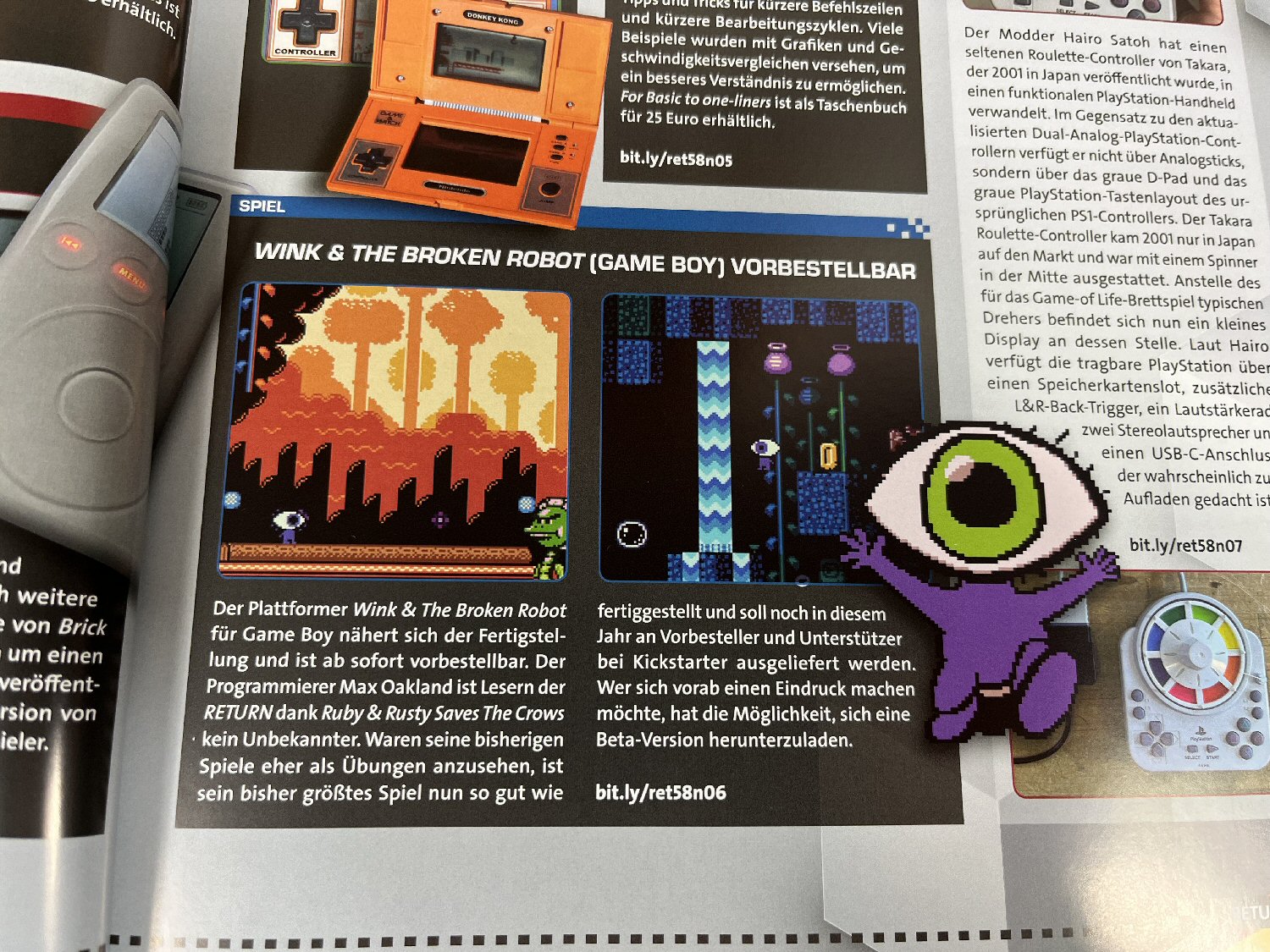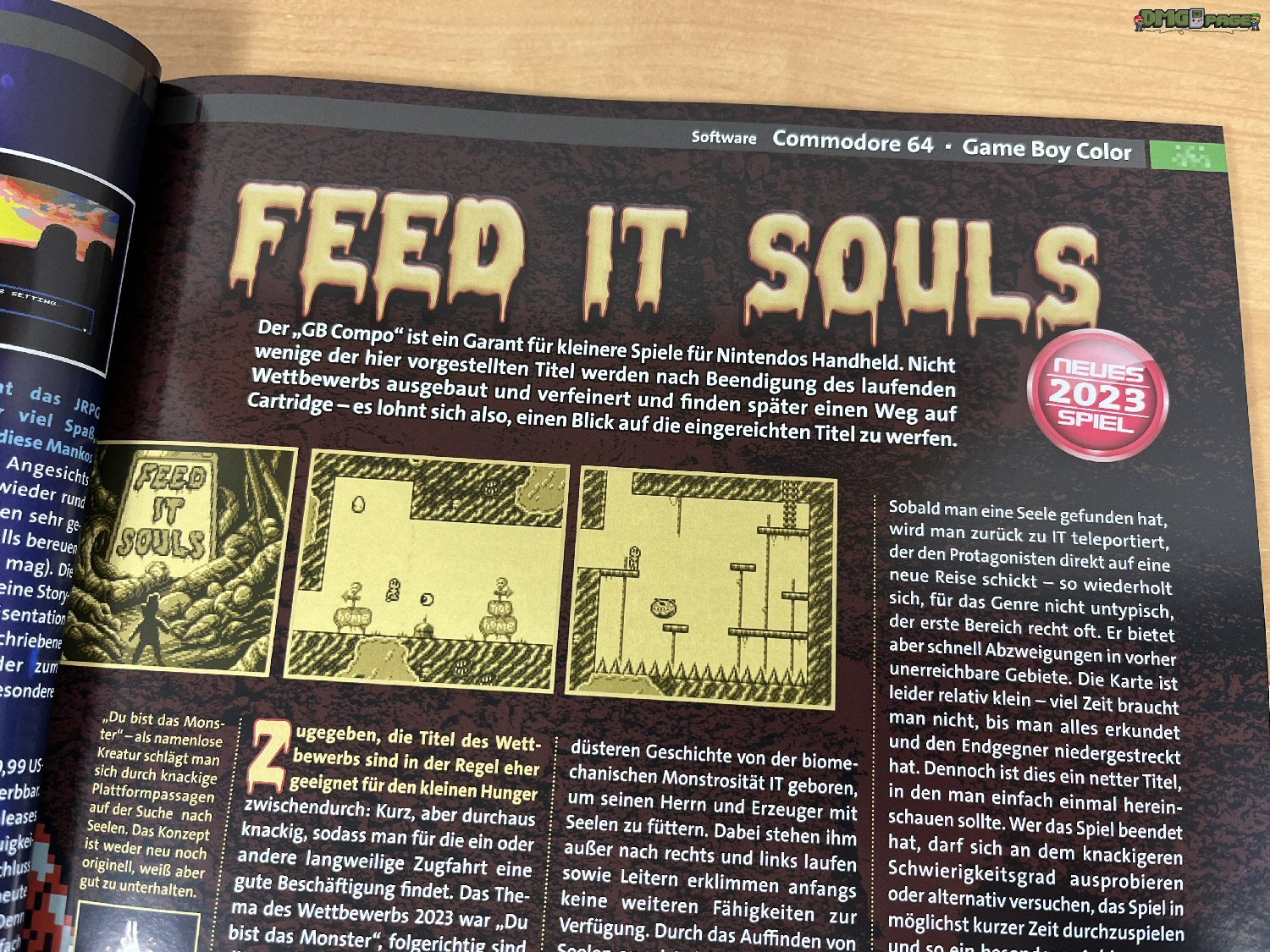 Auch in der aktuellen Ausgabe der Return werden Game Boy-Fans schnell fündig. Bereits in der News-Übersicht auf Seite 7 gibt es mit Wink & The broken Robot einen ab sofort vorbestellbaren recht umfangreichen Homebrew-Titel. Über einen ganzseitigen Bericht darf sich hingegen Feed it Souls freuen. Der Grusel-Titel ist 2023 erschienen und schickt euch in einer metroidvania-typischen Spielgestaltung auf die Suche nach Seelen. Neben der Begegnung mit verschiedenster Monster, fallen besonders die knackigen Plattformpassagen auf.