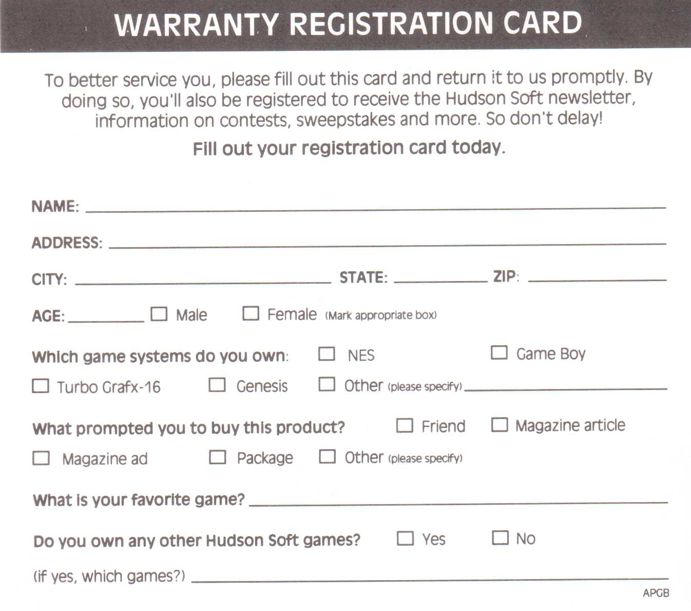 (pwc) Dem Spiel Adventure Island liegt eine Software Warranty- und Registration Card bei. Dies ist die erste Karte in meinem Besitz, welche die Garantie und Registrierung kombiniert. Mit der Registrierung zur Garantie stellt ihr dem Hersteller eure Kontaktdaten zur Verfügung. Dafür bekommt ihr den Hudson Soft Newsletter zugeschickt, der euch weitere Informationen bietet.