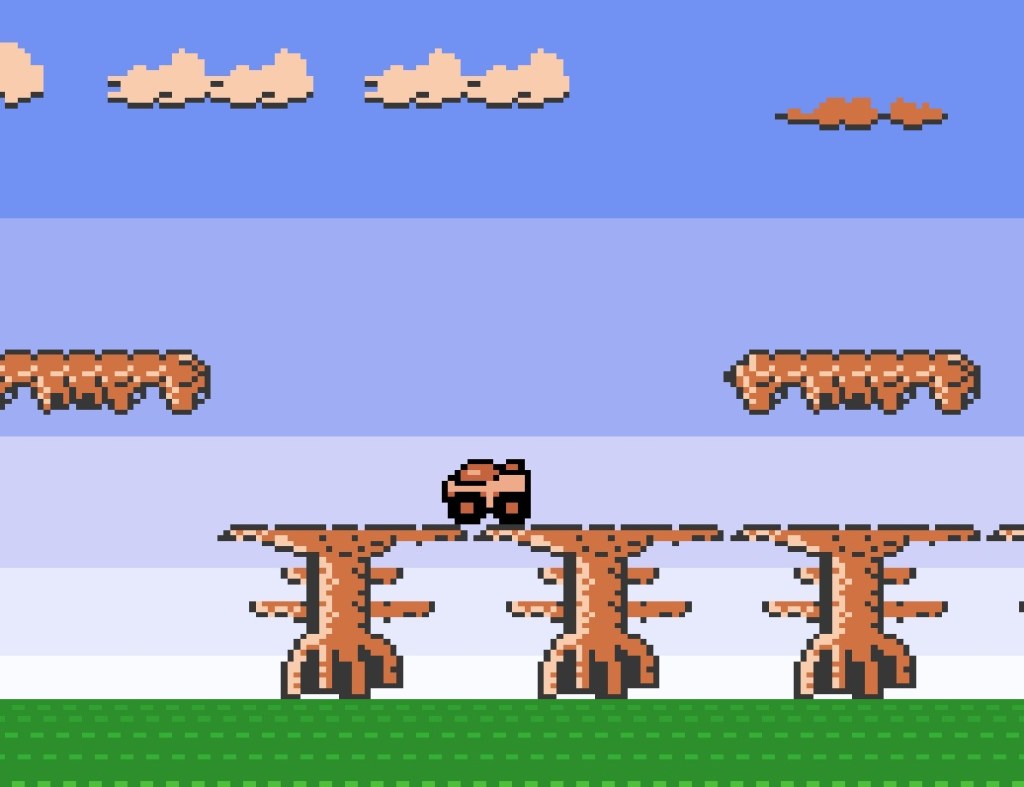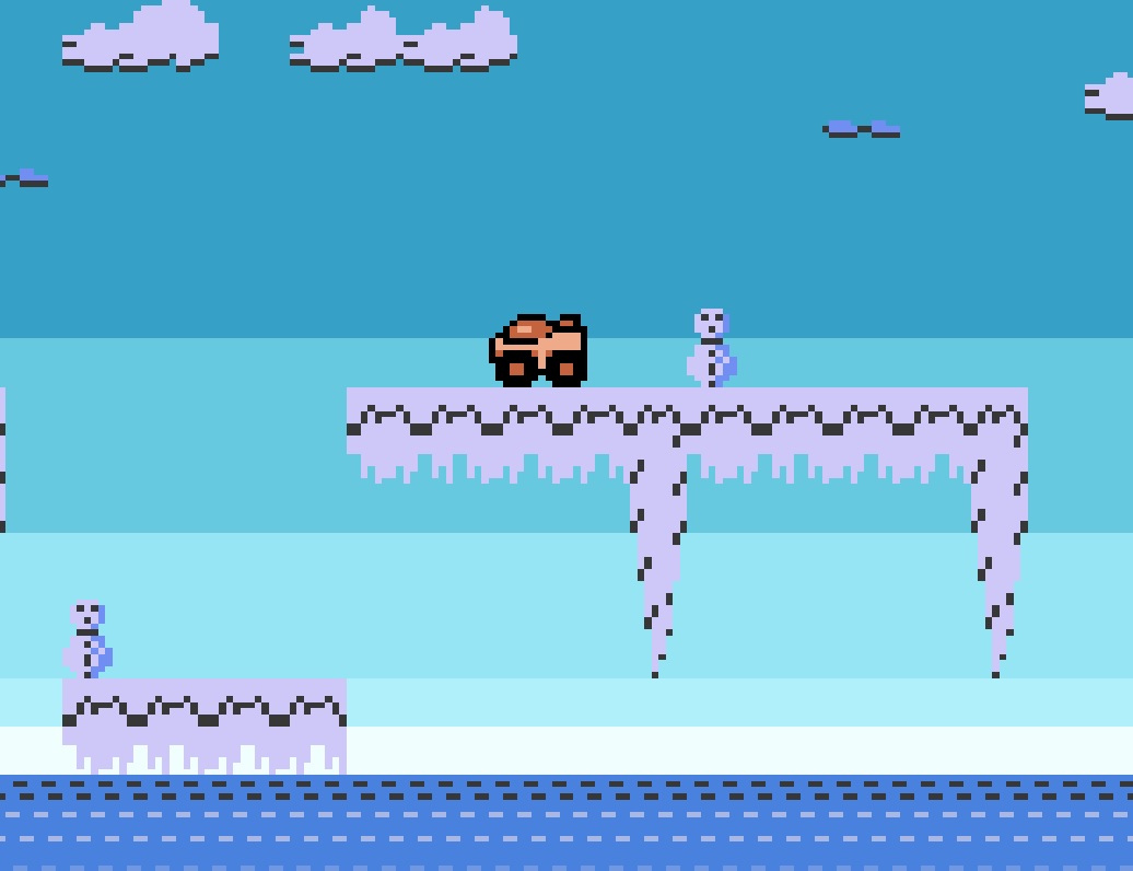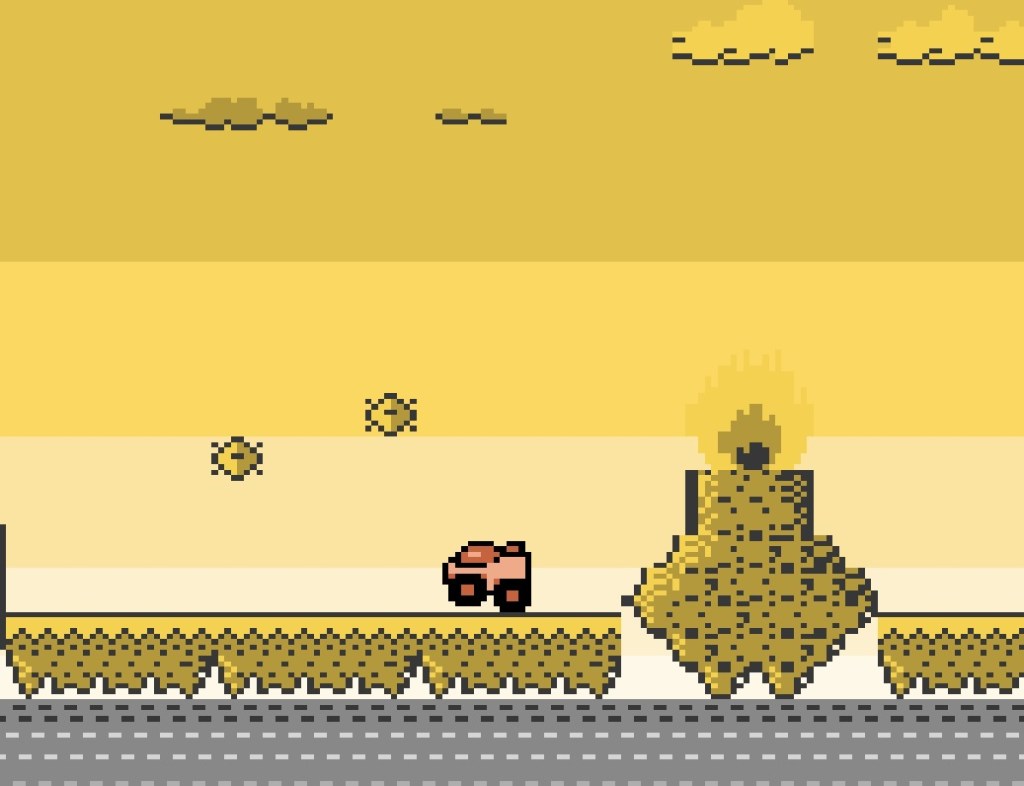 Ziel des Spieles ist es, mit dem Buggy vom rechten Bildschirmrand aus startend das Levelende am linken Bildschirmrand zu erreichen. Das geht eigentlich recht entspannt zu, denn Gegner gibt es keine und der Hintergrund scrollt auch nicht automatisch vor. Mit dem Steuerkreuz bewegt man sich vor und zurück und mit B springt man über Hindernisse oder Abgründe. Hierbei wirkt sich die Intensität des Tastendrucks auf die Sprungweite aus. An einigen Stellen ist es wichtig eine stetige Geschwindigkeit aufrecht zu halten, weil es sonst eventuell etwas knapp beim Springen werden könnte. Grundsätzlich ist aber eher ein behäbiges und vorausschauendes Fahren zu empfehlen. Profis bewegen sich durch die Level mit gedrückter Vorwärtstaste – bei mir war es eher ein Stop and Go^^