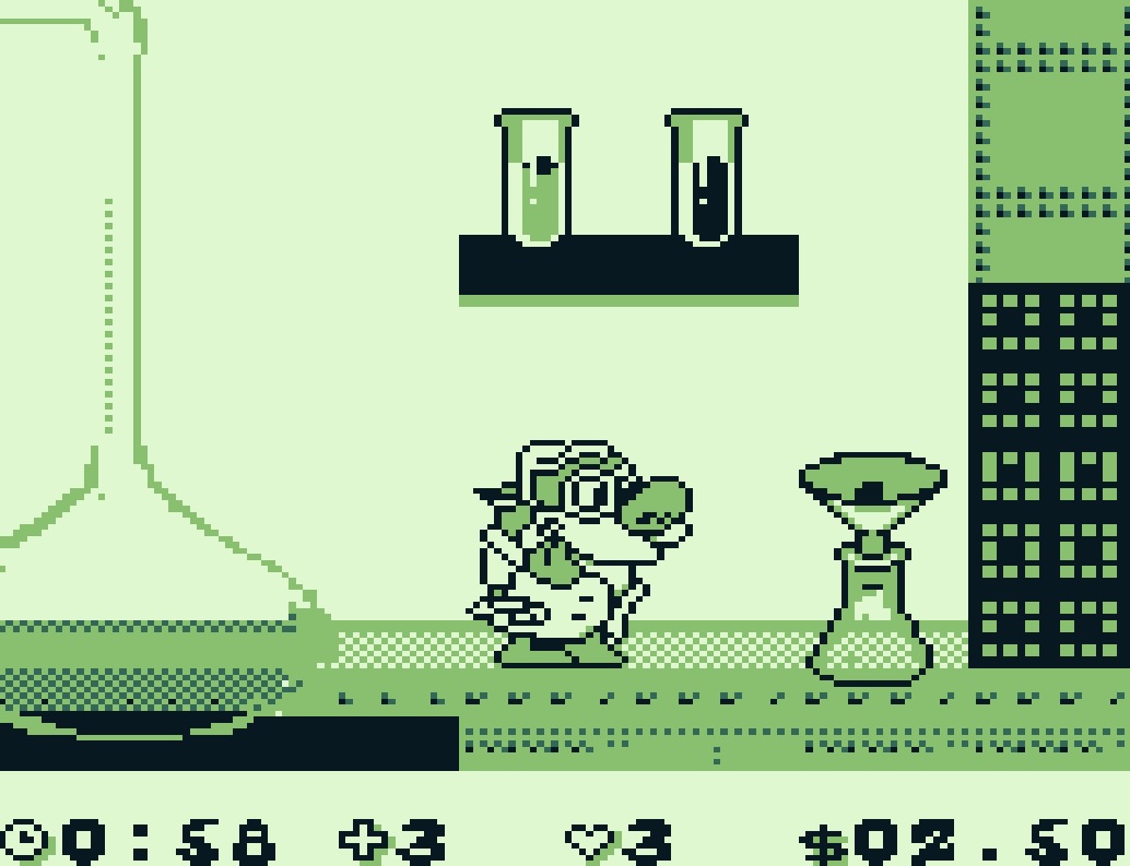 Das Game Boy-Level ist in insgesamt sechs Laborabschnitte unterteilt. Im Hintergrund fallen direkt die etlichen Glaszylinder, Reagenzgläser und Bunsenbrenner auf. Hier gilt es Trampoline einzusetzen, Chemikalien zu mischen, um eine explosive Substanz zu erzeugen, Schalter zur Aktivierung beweglicher Plattformen zu drücken oder auch Barrieren mit einem Gasbrenner zu beseitigen. Im sechsten Abschnitt ist der Glücklichmach-Helm gebaut und muss nur noch mit dem richtigen Timing auf Rens Kopf geworfen werden.