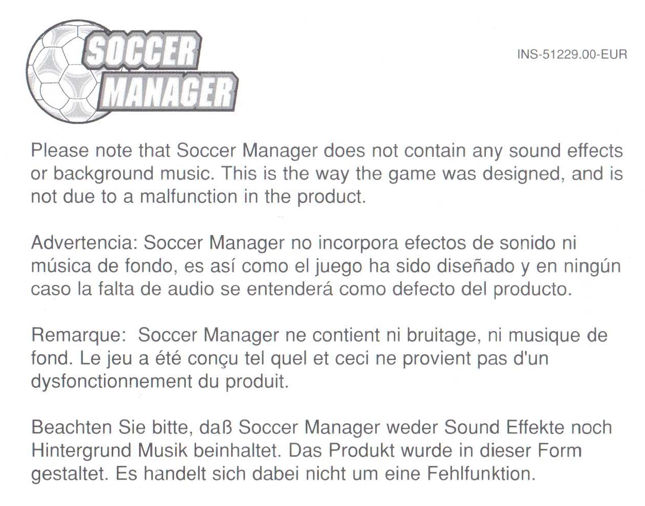 (pwc) Das Game Boy Color-Spiel Soccer Manager kommt ganz ohne Soundeffekte und Hintergrundmusik aus. Dies ist in der Game Boy Welt eher unüblich. Dass es sich hierbei aber nicht um eine Fehlfunktion handelt, erklärt der dem Spiel beiliegende Hinweiszettel. Danach wurde das Spiel nämlich ganz bewusst so programmiert, was bedeutet: Umtausch zwecklos!