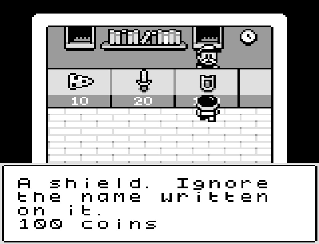Die Sache lässt dir aber keine Ruhe und du begibst dich auf Erkundungstour. Zum Glück ist die Insel sehr klein und damit recht übersichtlich. Im Souvenirshop wird Käse (10 Münzen), ein Schwert (20 Münzen) und ein Schild (100 Münzen) verkauft. Lauter tolle Sachen, die du dir zu Spielbeginn noch nicht leisten kannst.