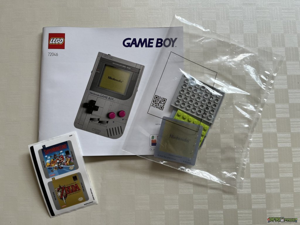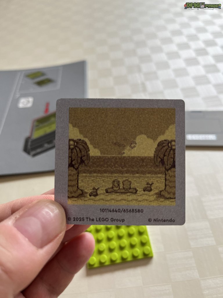 Absolut genial umgesetzt sind die drei beiliegenden Lentikular-Bilder. Die umgangssprachlich auch als Wackelbilder bekannten Linsenrasterbilder könnt ihr nach Belieben in das Game Boy-Modell einsetzen. Zur Auswahl stehen euch das bewegliche Nintendo-Logo (Prüfkontrolle), sowie Szenen aus den beiden oben erwähnten Spielen. Für Lego-Freunde, die sich (zu Recht) über oftmals übertriebene Aufkleberbögen bei LEGO ärgern, kann ich Entwarnung geben: alle beschrifteten Bauteile sind tatsächlich bedruckt. Die einzigen beiden Aufkleber im Set, sind die Modulaufkleber für die beiliegenden Spiele.