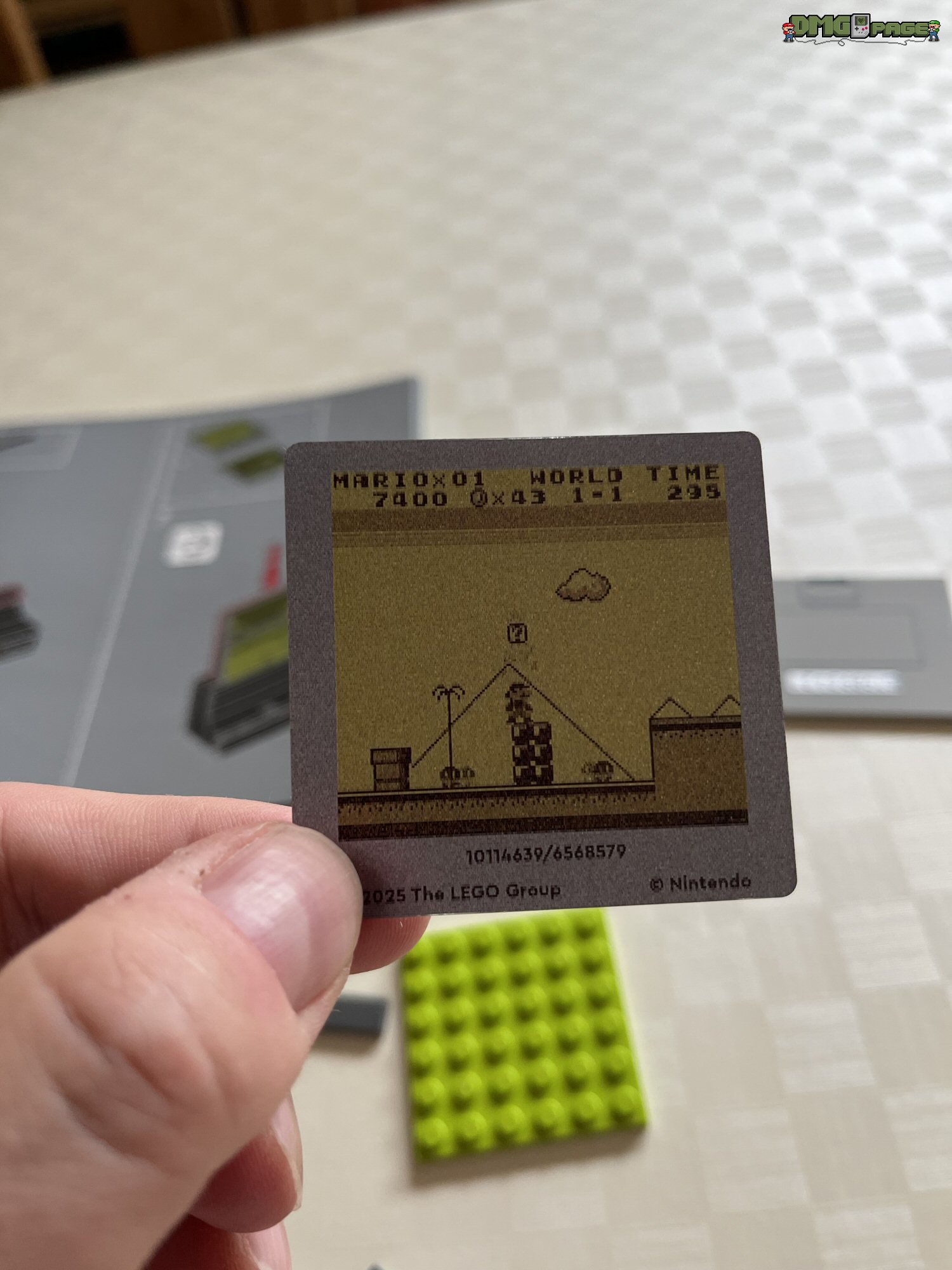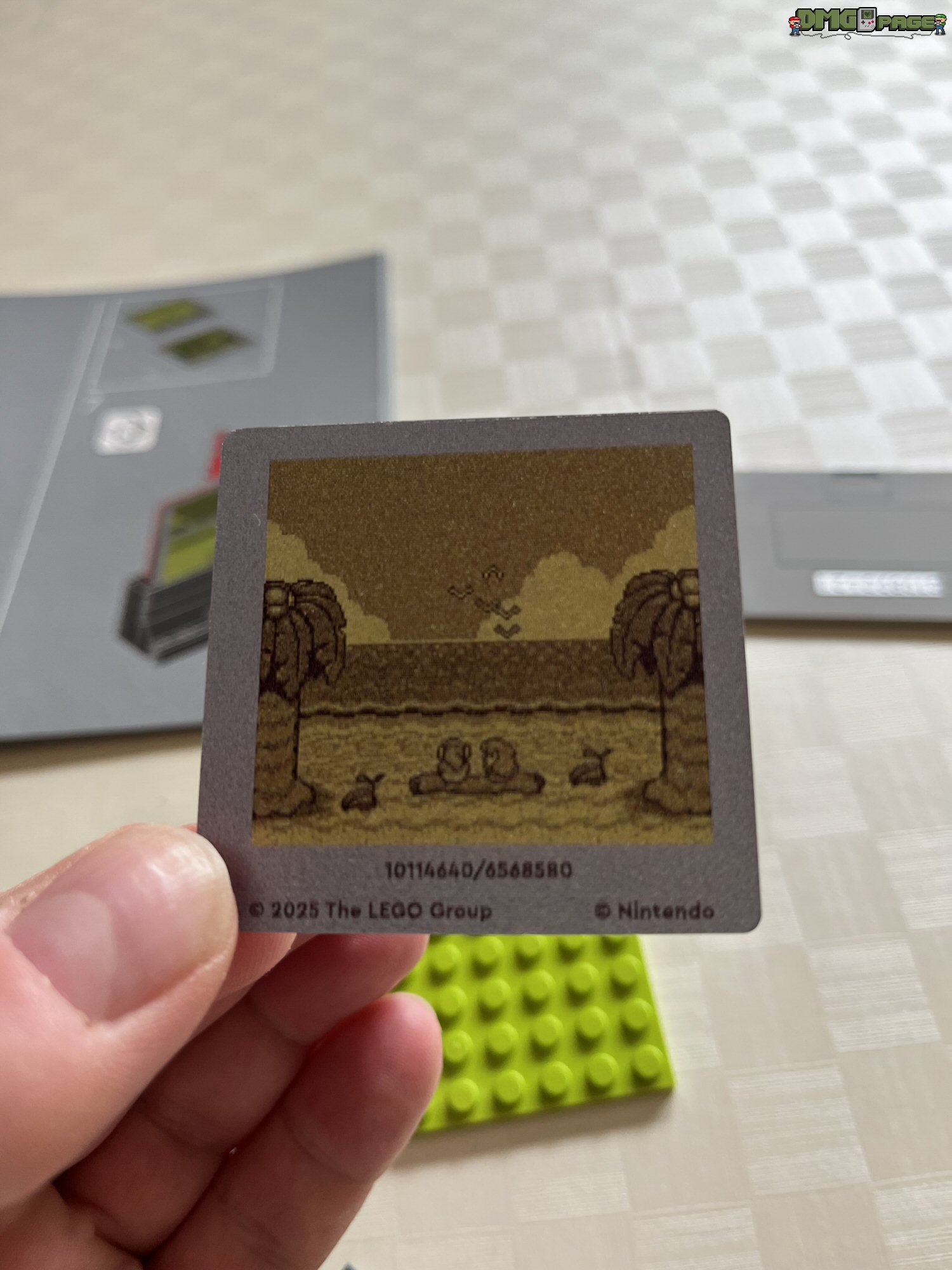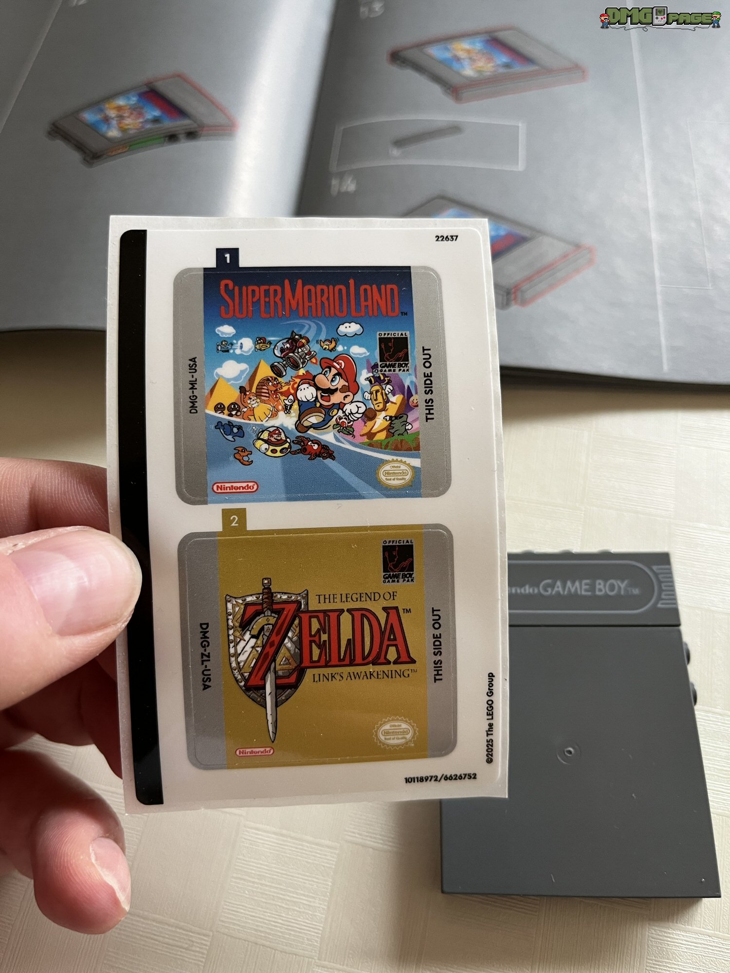 Absolut genial umgesetzt sind die drei beiliegenden Lentikular-Bilder. Die umgangssprachlich auch als Wackelbilder bekannten Linsenrasterbilder könnt ihr nach Belieben in das Game Boy-Modell einsetzen. Zur Auswahl stehen euch das bewegliche Nintendo-Logo (Prüfkontrolle), sowie Szenen aus den beiden oben erwähnten Spielen. Für Lego-Freunde, die sich (zu Recht) über oftmals übertriebene Aufkleberbögen bei LEGO ärgern, kann ich Entwarnung geben: alle beschrifteten Bauteile sind tatsächlich bedruckt. Die einzigen beiden Aufkleber im Set, sind die Modulaufkleber für die beiliegenden Spiele.