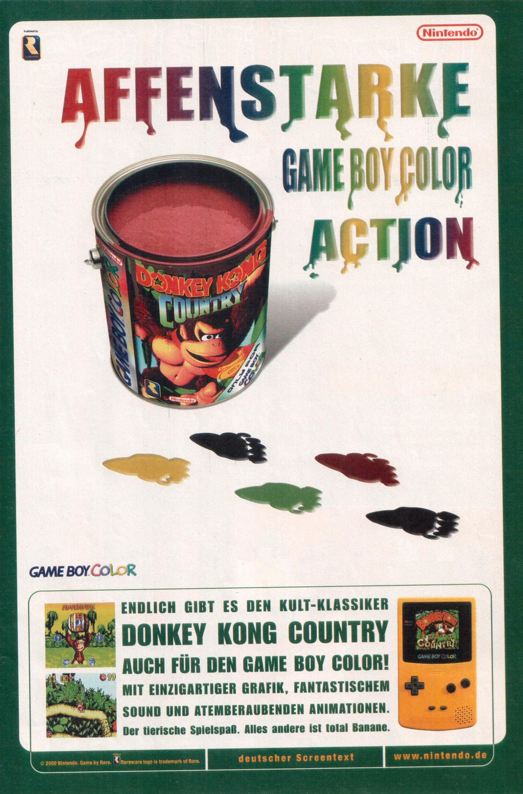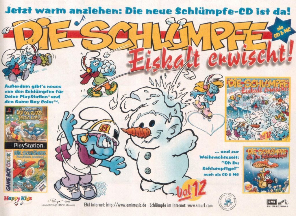 (pwc) Vor 25 Jahren war in den Micky Maus-Heften noch Game Boy-Werbung zu finden. Die Ausgabe vom 23.11.2000 präsentiert uns „Affenstarke Game Boy Color Action“ mit Donkey Kong Country für den Game Boy Color. Vom Urwald geht es in kältere Regionen: die neue Schlümpfe-CD/MC Vol. 12 „Eiskalt erwischt!“ ist da. Unten links in der Ecke: Die Schlümpfe Das grosse Abenteuer – ebenfalls für den Game Boy Color.