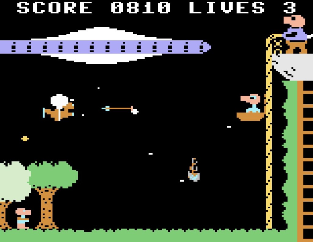 Dein Aussichtspunkt ist ein Korb, der von deinen Schweinchenfreunden heruntergelassen und wieder hochgezogen wird. Diese Bewegung gibt dir genügend Freiraum, die immer vom linken Bildschirmrand aus angreifenden Wölfe mit deinen Pfeilen zu treffen. Pro Level gilt es erst die Angriffswelle (4 Wölfe) abzuwehren, bevor du dich in vermeintlicher Sicherheit in die linke untere Ecke begeben musst, um dort das Ferkel zu retten. Dabei ist Vorsicht geboten, denn das Raumschiff thront dauerhaft über dir und ist auch ohne die Wölfe äußerst wehrhaft.