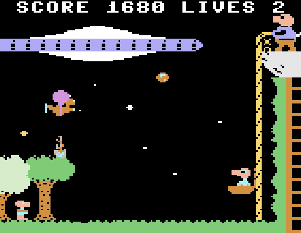 Dein Aussichtspunkt ist ein Korb, der von deinen Schweinchenfreunden heruntergelassen und wieder hochgezogen wird. Diese Bewegung gibt dir genügend Freiraum, die immer vom linken Bildschirmrand aus angreifenden Wölfe mit deinen Pfeilen zu treffen. Pro Level gilt es erst die Angriffswelle (4 Wölfe) abzuwehren, bevor du dich in vermeintlicher Sicherheit in die linke untere Ecke begeben musst, um dort das Ferkel zu retten. Dabei ist Vorsicht geboten, denn das Raumschiff thront dauerhaft über dir und ist auch ohne die Wölfe äußerst wehrhaft.