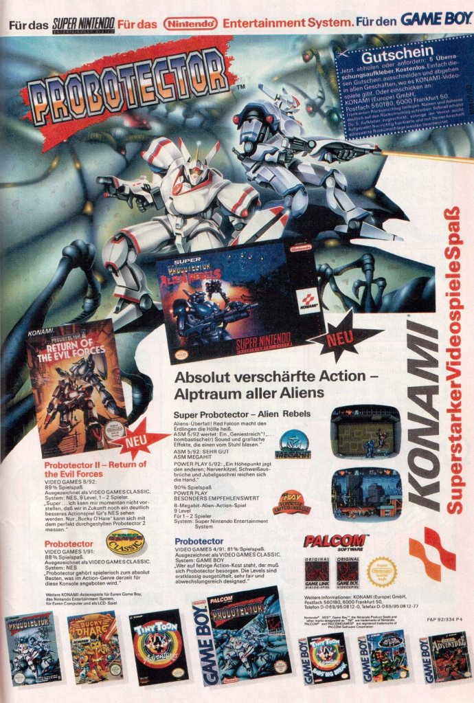 (pwc) „Absolut verschärfte Action – Alptraum aller Aliens“. Diese Konami-Werbeanzeige bewirbt plakativ Probotector II (NES) und Super Probotector (SNES). Allerdings entdecken wir noch weitere Spiele – darunter einige Game Boy-Titel wie Tiny Toon Adventures Babs‘ Big Break, The Castlevania Adventure und Teenage Mutant Hero Turtles Back from the Sewers. Als Bonus erhaltet ihr einen Gutschein, mit dem sich 5 kostenlose Überraschungs-Aufkleber anfordern ließen.