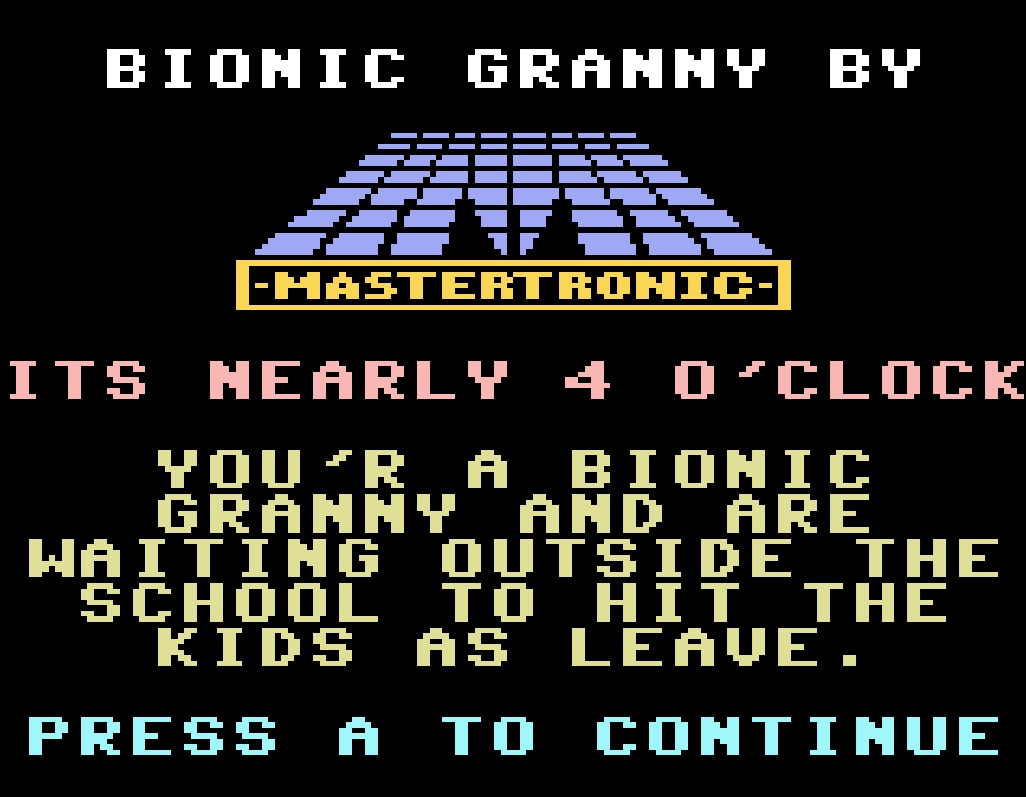 Bionic Granny ist so simpel, dass es bereits nach wenigen Minuten beginnt langweilig zu werden. Den Ton schaltet ihr am besten gleich ab. Das Budget-Spiel, dass seinerzeit für £1.99 GBP auf Kassette verkauft wurde, ist seinen Preis wert – mehr aber auch nicht. Habt ihr Interesse als garstige Oma den Kinderschreck zu spielen? Dann ladet euch das Spiel ►hier herunter.