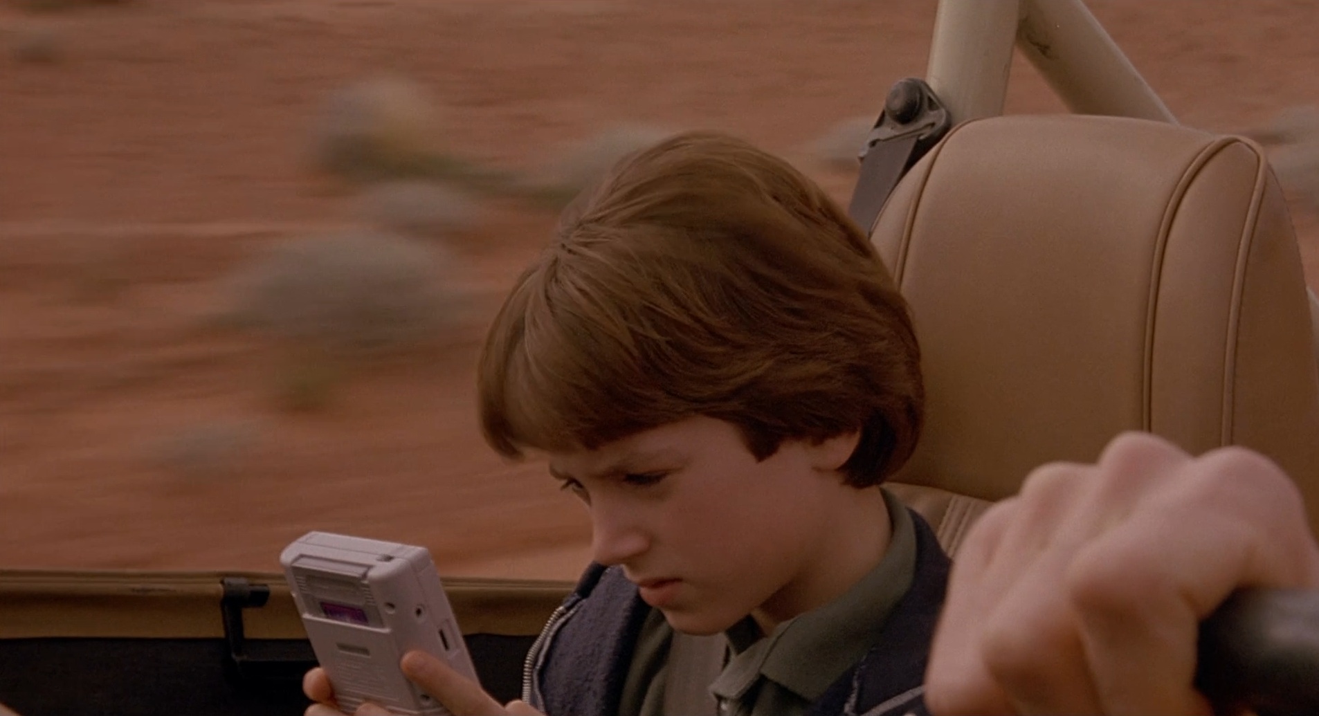 Auf der Hinfahrt spielt Mark im Jeep mit seinem Game Boy. Dabei ist die eingelegte Cartridge gut zu erkennen: Tetris!